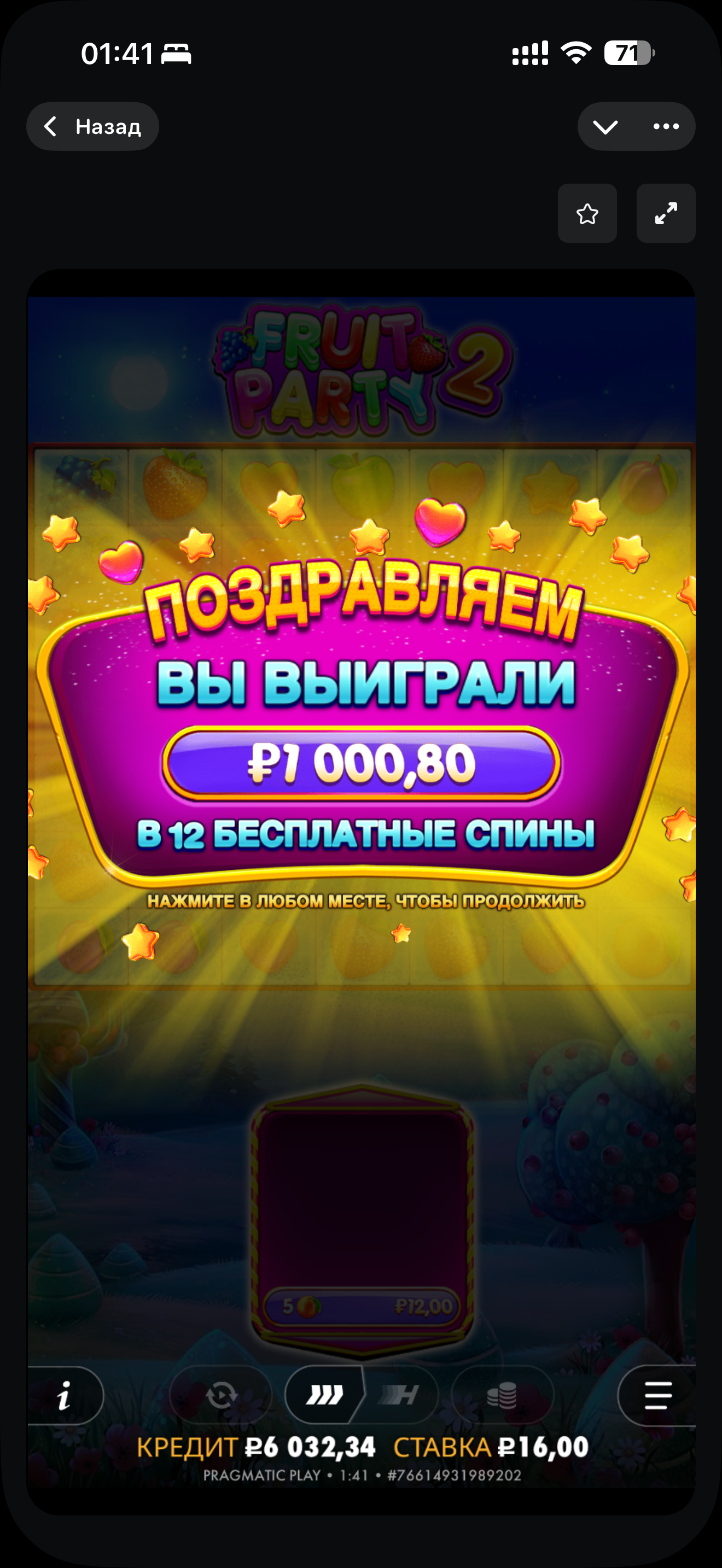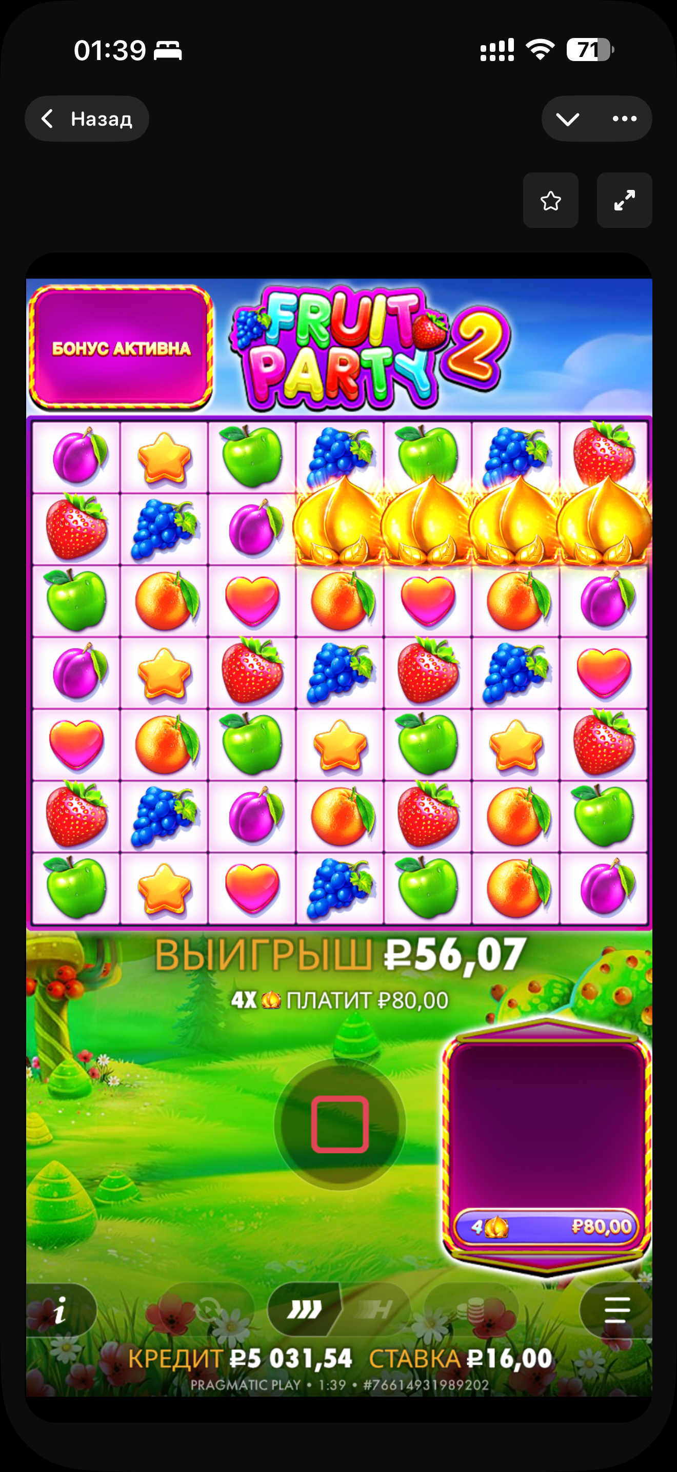 Усім прывіт! Гісторыя пра тое, як я купіў Бонус у fruit party 2 на джэттоне. Мне выпала 4 скатэры. Я гэта бачыў упершыню. Шкада, што нічога гэта амаль не дае, проста плюс 2 спіны. Грала, канешне, амаль кожны спін, але я праўда не разумею, як у гэтым слоце можна занесці. Некалькі разоў было 2 вилда па 9х, але свгровкі давалі максімум па 200 рублёў, а Вилд х81 я наогул не бачыў. Бонус у выніку дала ўсе 1000 рублёў. Усім жадаю заносаў!!