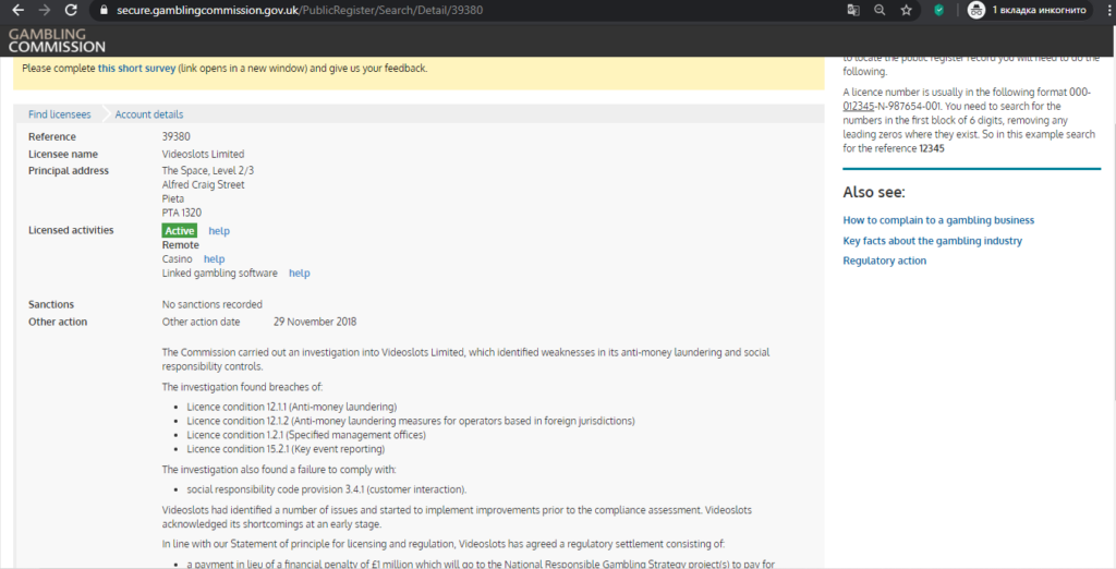 Проверить лицензию онлайн казино можно на странице https://secure.gamblingcommission.gov.uk/PublicRegister/Search. Необходимо будет указать название заведения или ссылку на него.
