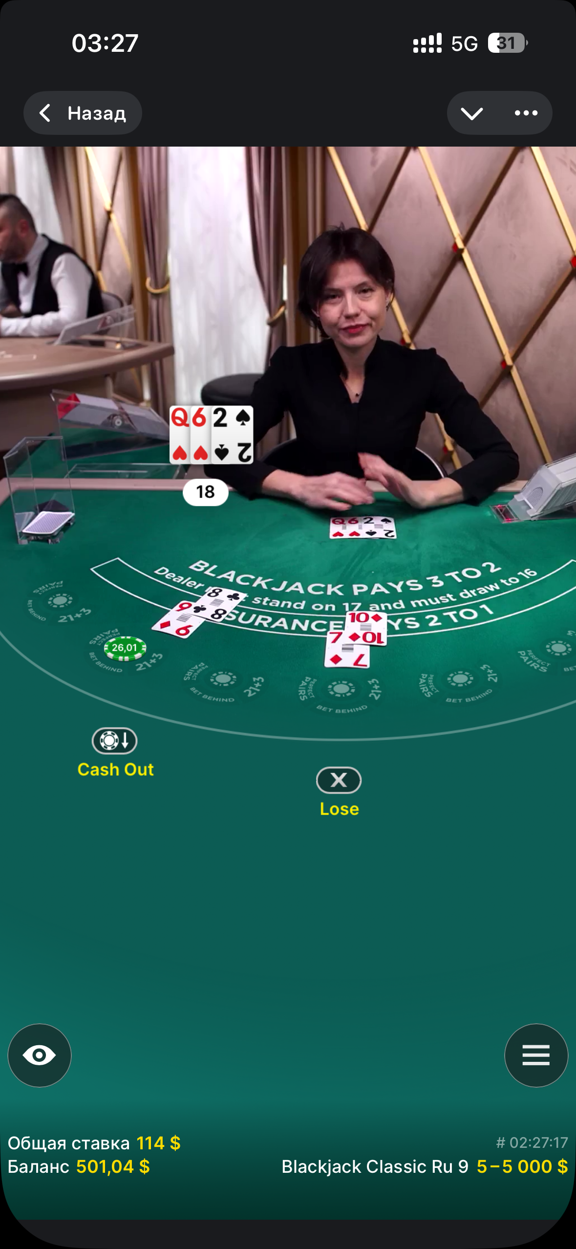 Остались всего 3 финальных ставки в блекджеке, которые подведут итоги этой сессии. Снова ставка 114$, тут мне дало 17 на обоих руках, а диллеру в очередной раз 10. На одной руке я решил сделать кешаут, а на второй понадеяться что диллер переберет. Но даже с 16 диллер набирает 18 очков.