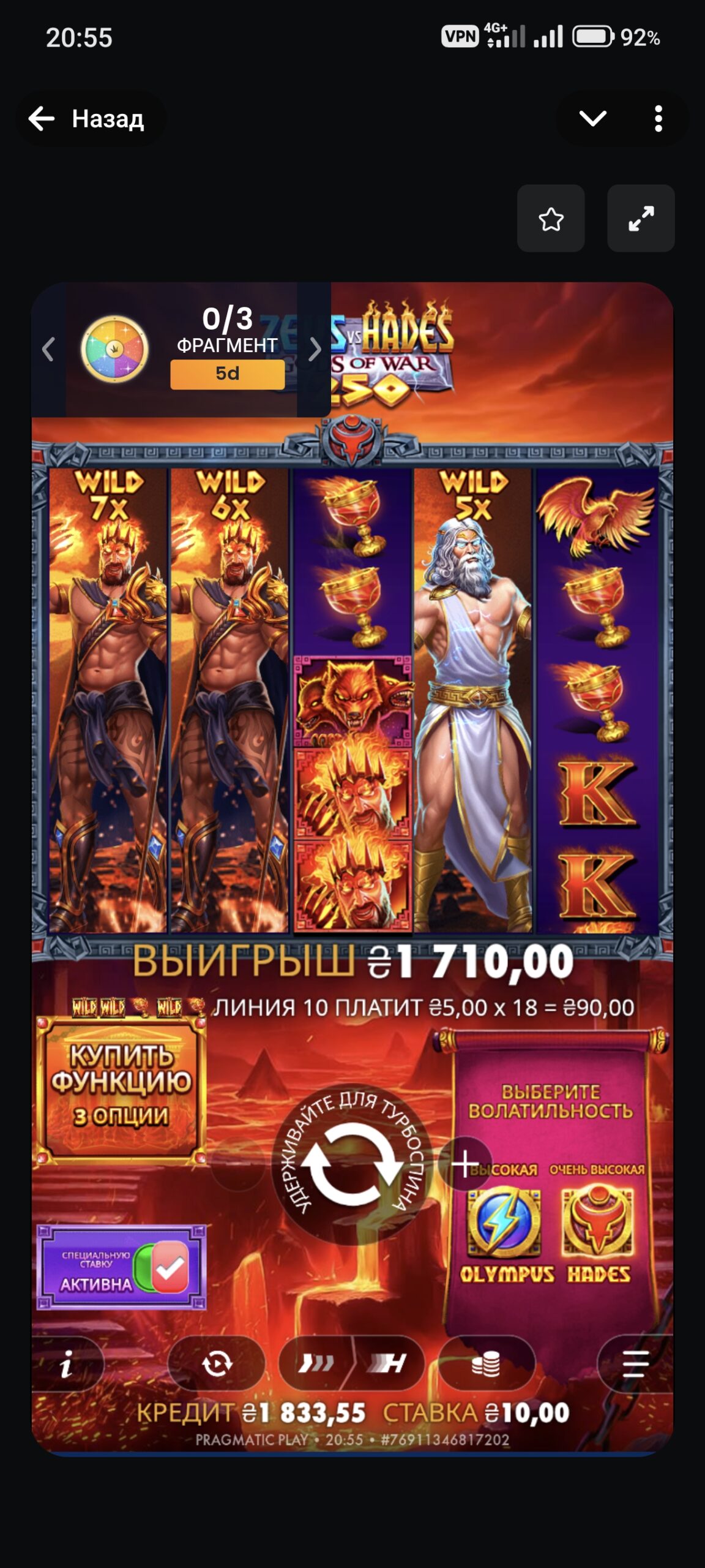 Учора ў VIP-канале жетона спіймаў промік і пайшоў гуляць у адзін са слотаў, слоты, вядома, ігралі мінімальна і далі ў суме 8.27$, што вельмі дрэнны вынік. Выцягваць смешна такую суму, а калі адыграць х1, застанецца 5$. Вырашыў зайсці ў Зевса 250, перад гэтым змяніў валюту і выйшла 364 грн, паставіў функцыю, дзе абавязкова выпадзе адна штора, стаўка змянілася на 10 грн і праз 10 спінаў спіймаў вось такую паляну. Прыемна атрымалася вывесці 40$, ўсім заносаў і ўдачы))