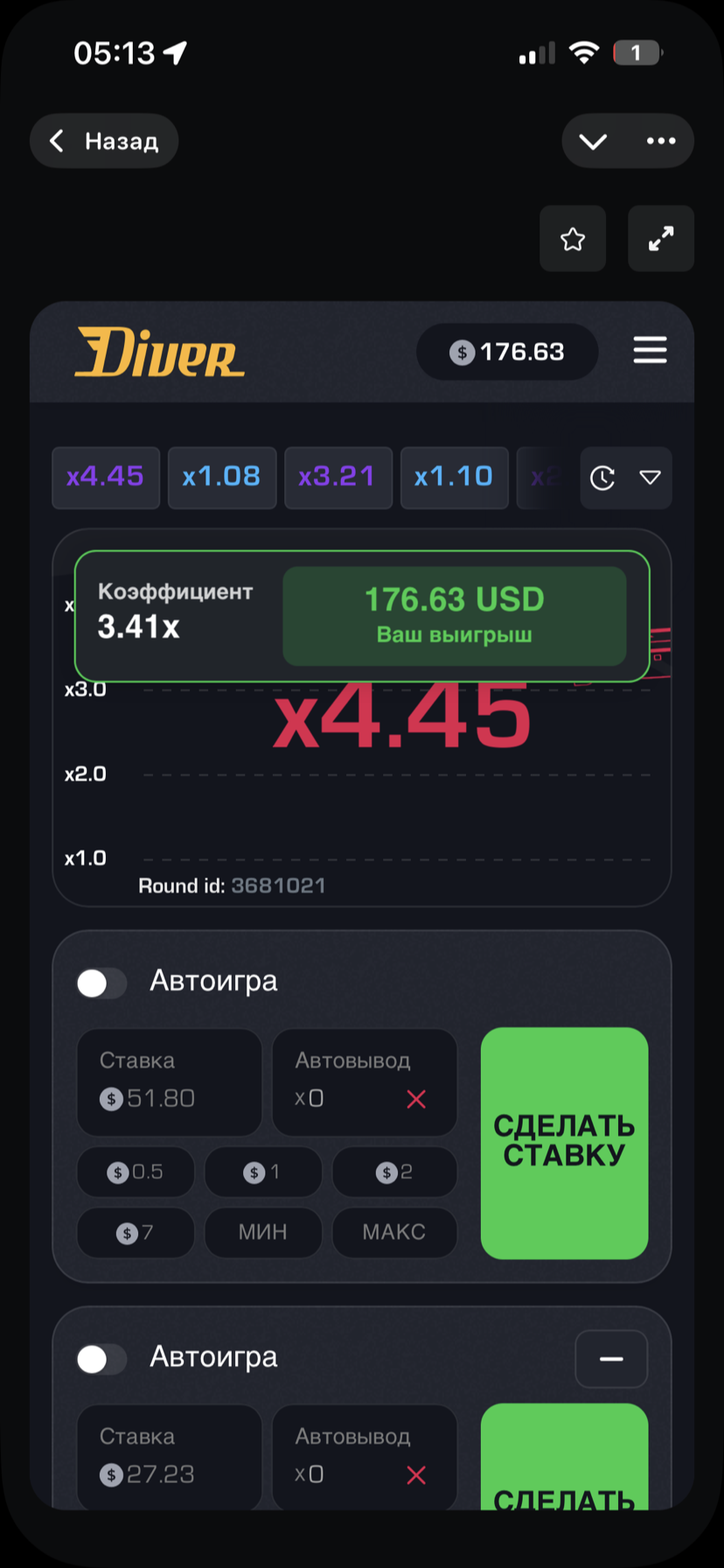 Ненавіджу такія рэжымы, дзе механікай з’яўляецца краш, але вырашыў паспрабаваць камбэкнуцца з 52$ у ім. Паставіў іх на гэтую ракету – і змог дацягнуць толькі да 3.41. Праз 2 секунды яна выбухнула на каэфіцыі 4.45, так што я своечасова забраў. Але не асабліва фантан эмоцый быў, бо гэты рэжым усё роўна вельмі многа ў мяне з’еў. Увесь час лопаецца на 1.00х, у чым тады прикол? Як тут людзі тысячы баксаў робяць, я таксама ніколі не зразумею
