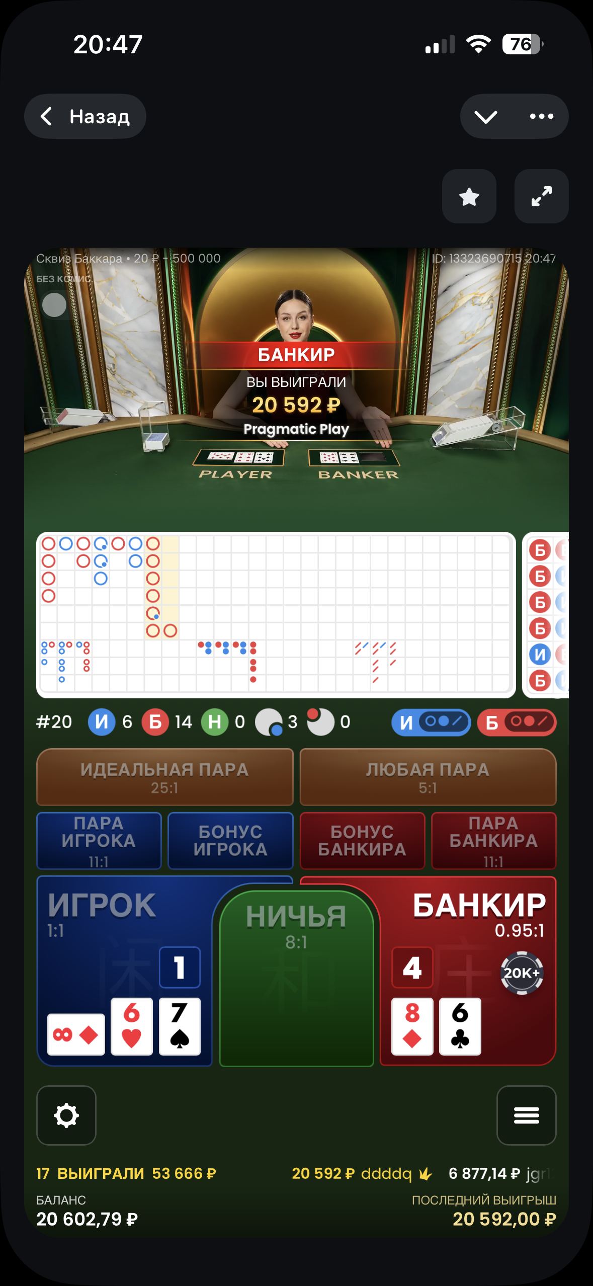 Цікавая сесія! Відаць, што нават пры назіранні за картамі банкір часам бярэ верх — сёмы запар выйгрыш гэта даказвае.