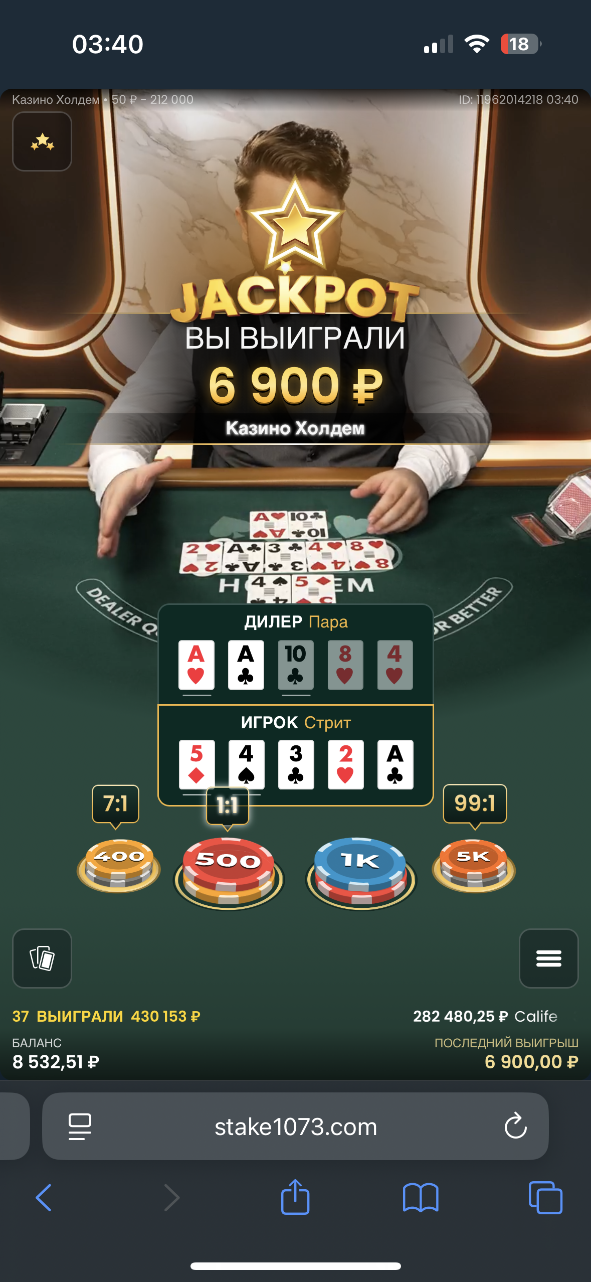 Решил я в первый раз проверить покер в Прагматике, хотя обычно играю в него только в Эволюшине. Большой плюс Прагматиковской версии – ставки на «Джекпот», где коэффициенты за бонусные комбинации реально сумасшедшие. Вот только я этого не знал и не открывал таблицу выплат, когда делал первые ставки, а стоило бы. Я умудрился словить в первых руках аж два стрита, и за каждый выплата шла 99:1 по джекпотовской ставке, которая была всего 50 рублей. Пойдёт конечно, обязательно продолжу играть тут