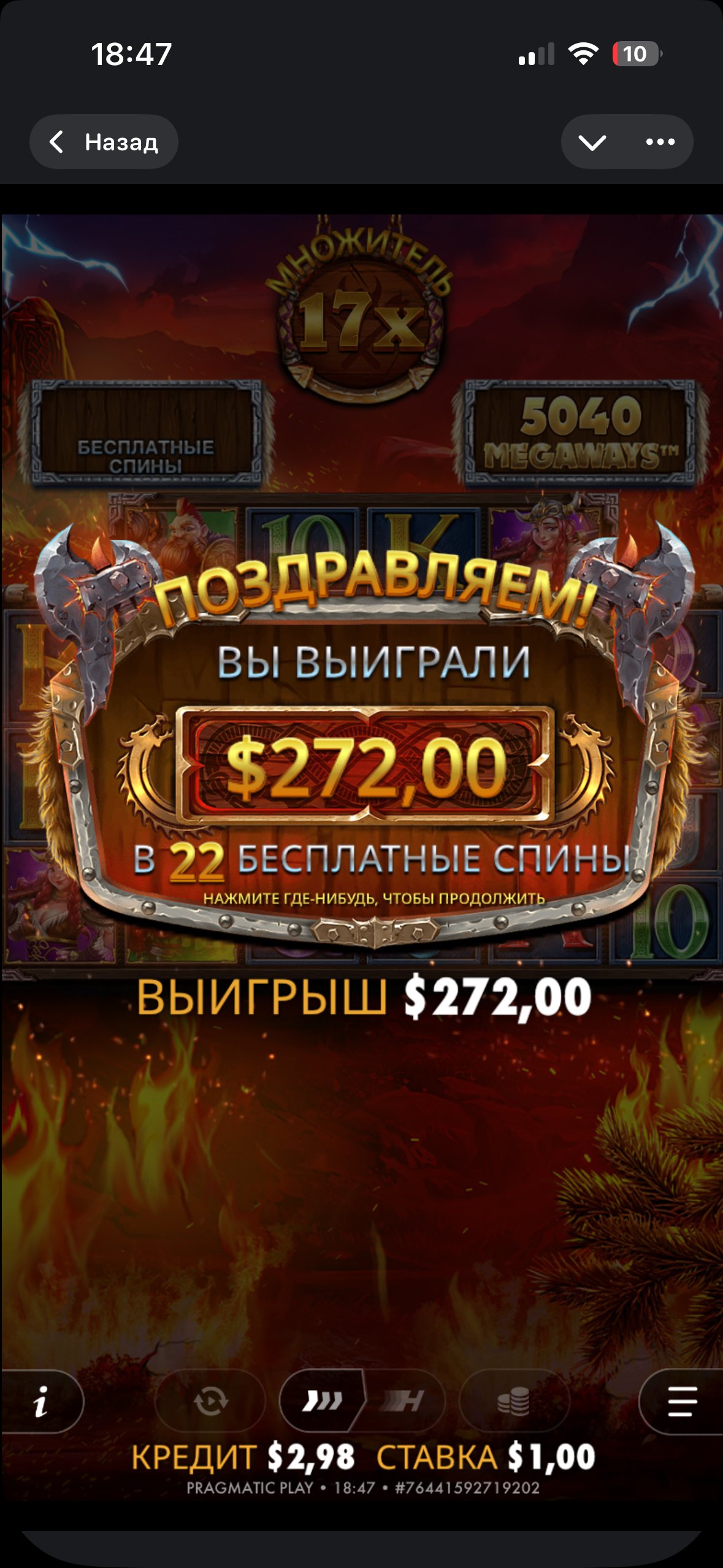 Здаецца, трохі мала для 22 спінаў і такой стаўкі, але і за гэта дзякуй! Віншую!