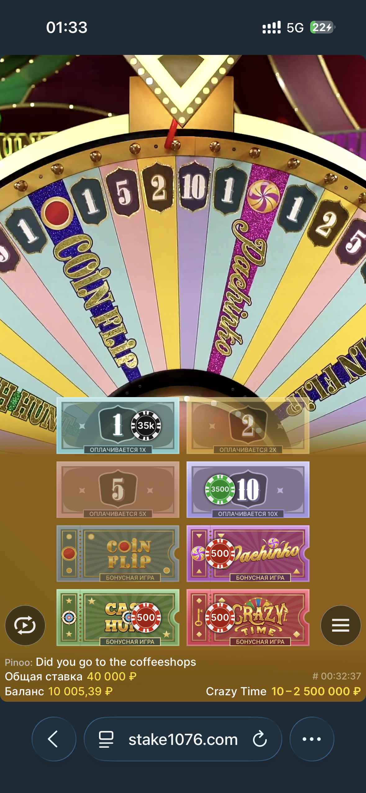 Стэйк, баланс 50к, у піке быў 70к. Вырашыў вельмі моцна рызыкнуць і зайшоў у кт, паставіў 35к на 1, 3500 на 10, і па 500 на бонускі. Я разумеў, што калі я не выйграю гэту стаўку, то шансаў на камбек амаль няма. На жаль, ні адно памнажэнне — ні на 1, ні на 10, ні на бонускі — не дало. Але я проста спадзяваўся злавіць 1. Кола круцілася прама да поля, дзе ёсць і 10, і 1, але ў выніку рэзка пачало тармазіць, і выпала 2…