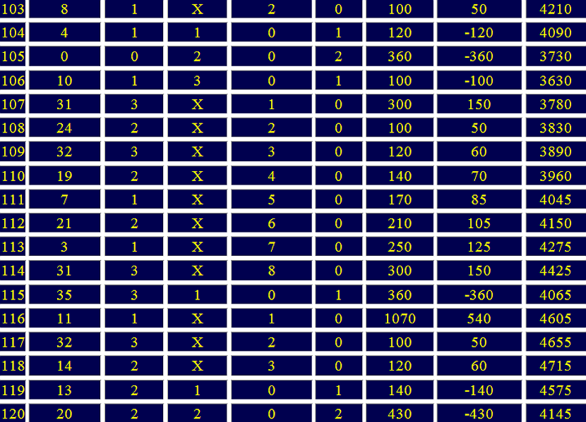 В таблице приведен пример игры по данному варианту системы. Столбец «Дюжина» содержит номер выпавшей дюжины. В графе «Смена дюжины» цифрами отмечено число ходов до предыдущей победы, а буквой Х – победы. В графе «Серия выигрышей» показана длительность победной серии. Кроме того, в соответствующих графах таблицы можно посмотреть общий размер ставки за конкретный ход, выигрыш за текущее вращение и общую прибыль.