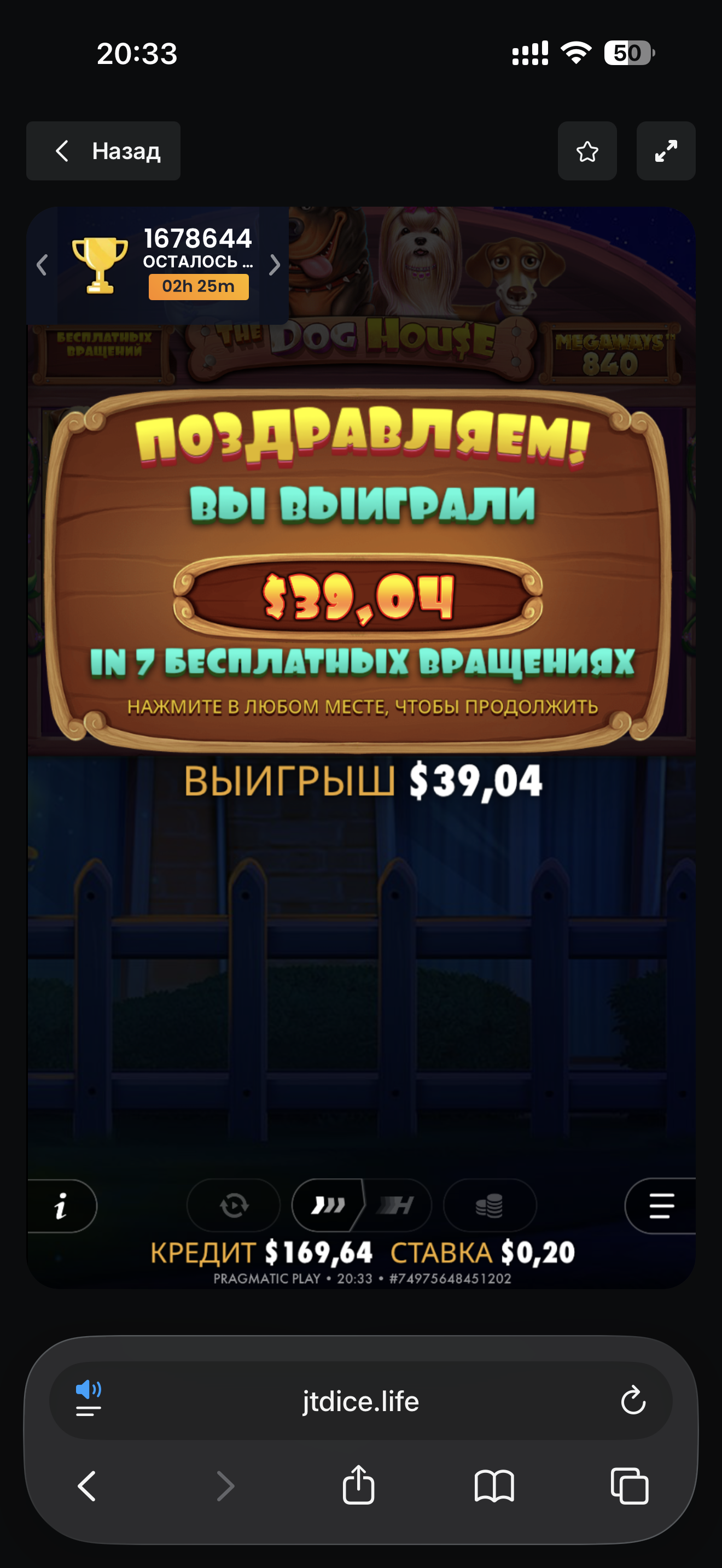 Всем привет! Недавно на джеттоне был промокод на 100 спинов. С этих спинов мне удалось выиграть 200 долларов и я решил пойти в the dog house. Ведь мой друг мне написал: «собаки сегодня очень хорошо дают» я решил поверить и купил Бонуску за 20 долларов. Как же приятно поставило с первого спина на 2,3 и 5 барабан. Я очень надеялся что закроет все барабаны вилдами и это будет занос, но этого не произошло. Конечно бонуска дала почти 40 долларов, но могло это быть намного вкуснее. Всем желаю заносов!