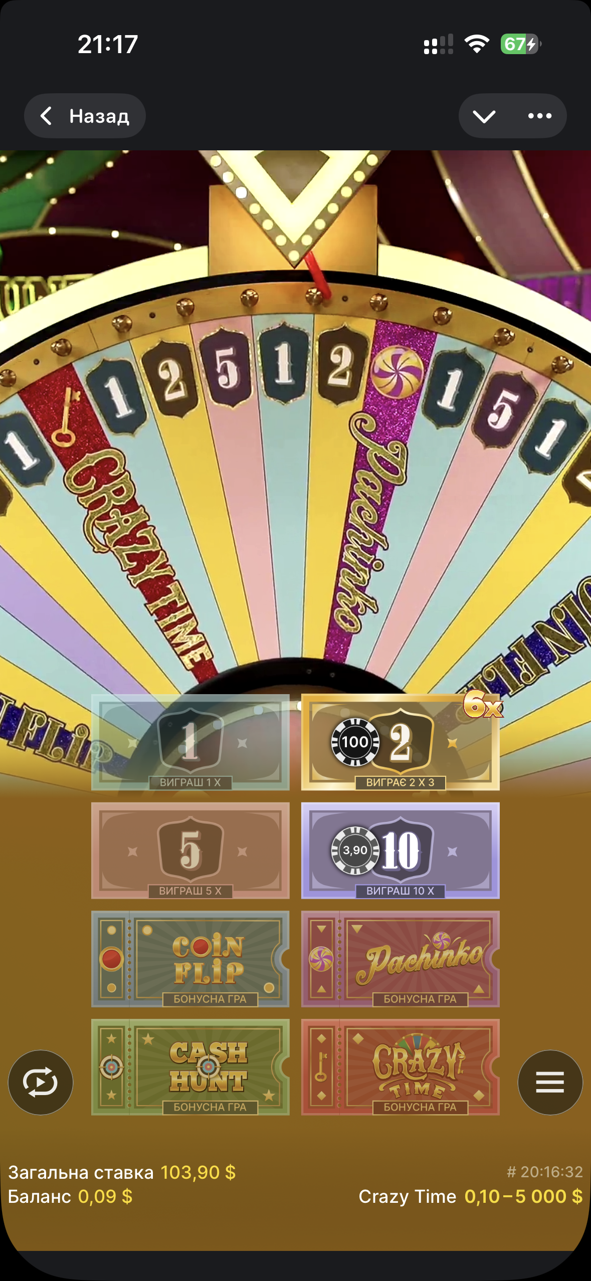 Пасля таго як я спачатку падняў 400$, і не змог дадаць да 500$, і пры алыне выйграў толькі 100$, я зразумеў, што гэта ўжо зліў, і мне нічога не падняць. Я зайшоў у крэйзі тайм, паставіў 100$ на 2 і 4$ на 10, выпала памнажэнне 3х на 2, а гэта значыць што выплата з 2 будзе 7х. Я не паверыў што яно дасць, так як там шанцаў на 2 амаль не было, але ў выніку выпала 2, і я выйграў нават больш чым хацеў вывесці.