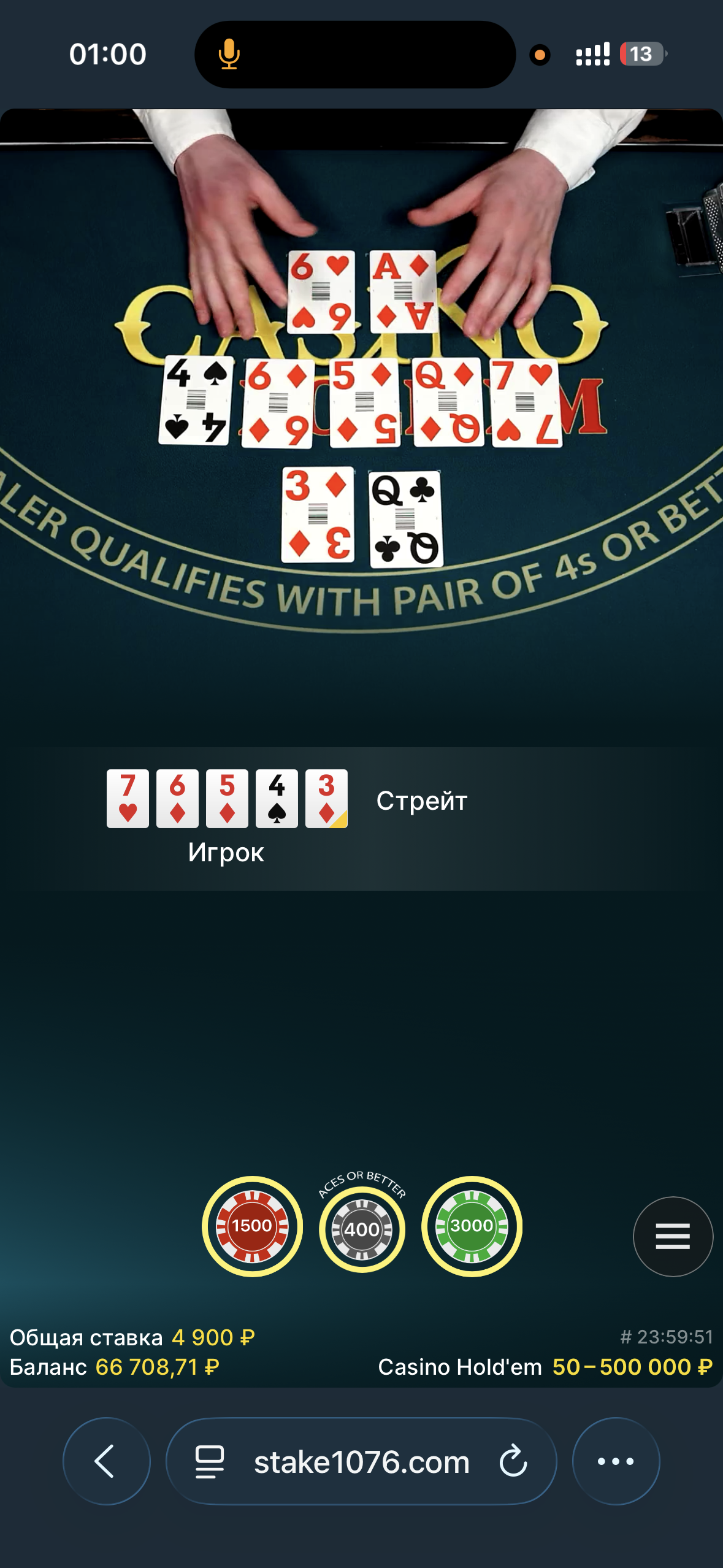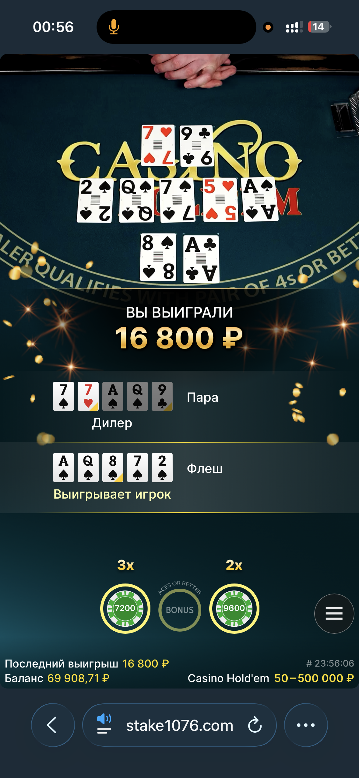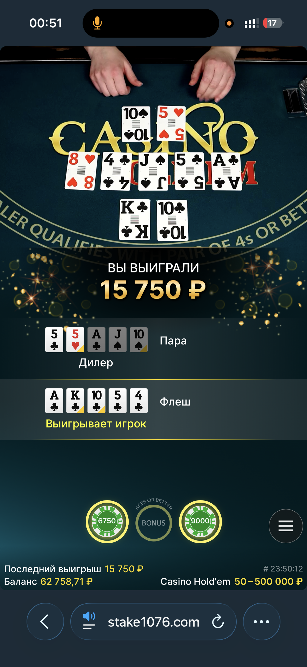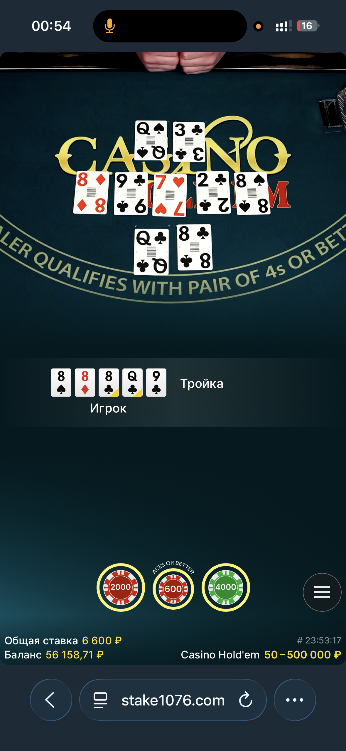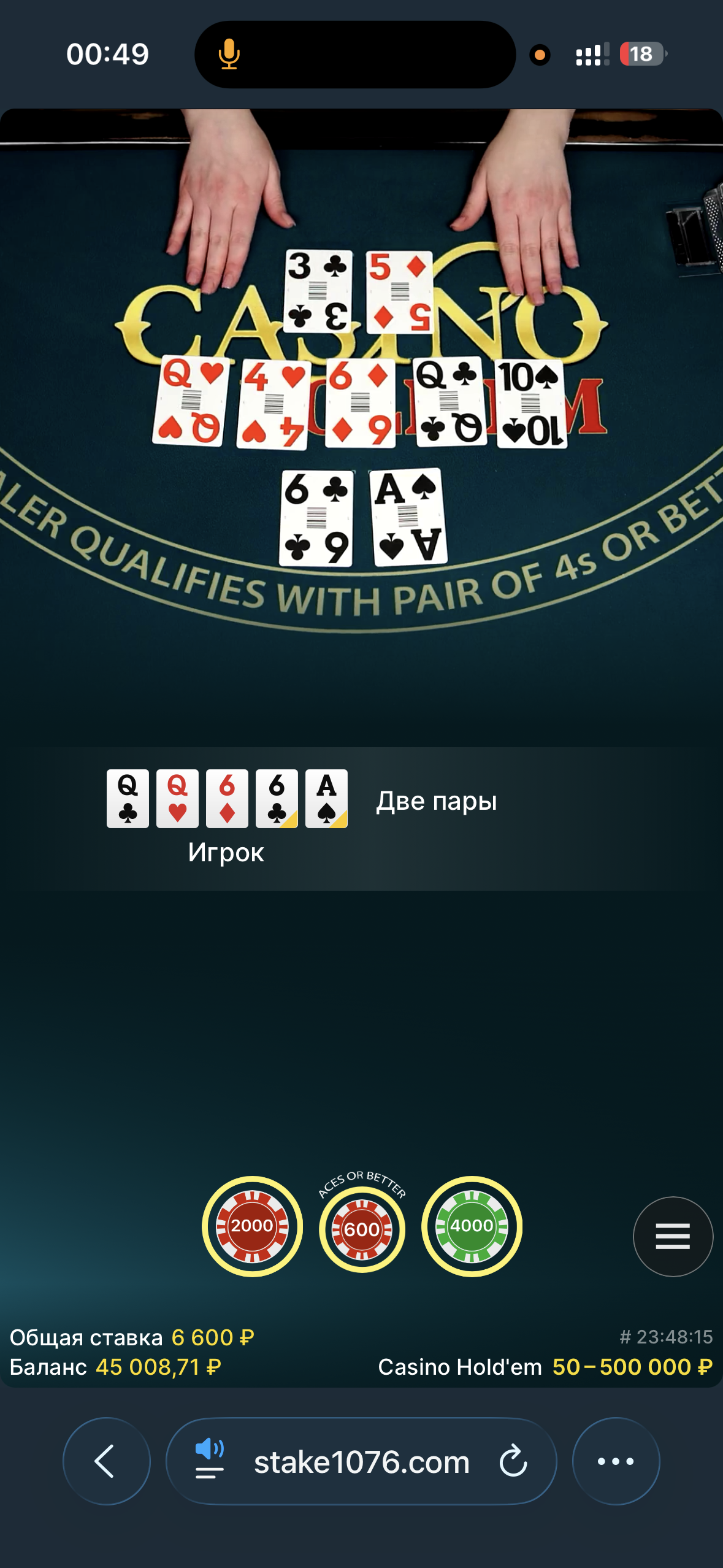 Стэйк, баланс 51к. Пасля кт пайшоў гуляць у покер, і не дарма. Першая стаўка 2000 і 600 на бонус. Бонус не даў, але дало пару шасці, а ў выніку 2 пары, а ў дылера толькі 1 пара.
