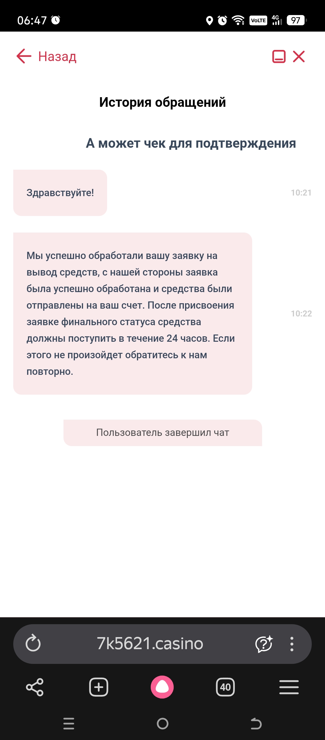 Колькі можна карміць абяцаннямі, чацвёрты дзень. Калі апрацоўка прайшла паспяхова, значыць павінен быць чэк. Паводле правілаў вашага ж казіно вывад да 15000 рублёў праходзіць на працягу трох дзён, а не невядома калі.
