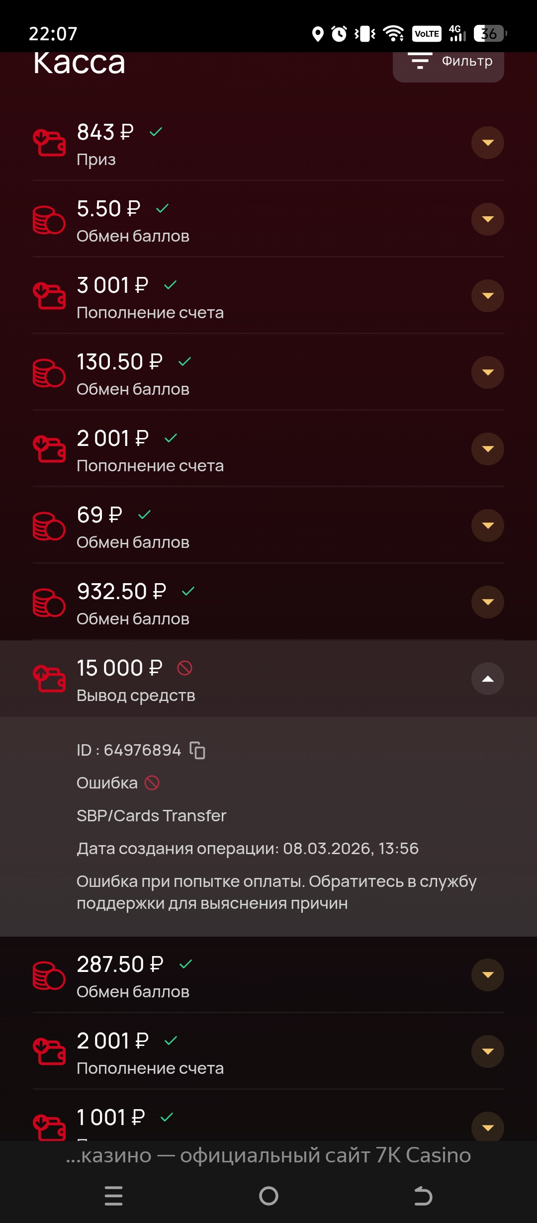 7k Casino: с 09.03.2026 не могу получить выплату на 189 USD