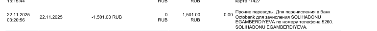 Удакладніла інфармацыю. Раней у вас прасіла прадставіць чэк па транзакцыі нумар 55039401. Гэта вашае папаўненне на 1501 рубель ад 22.11.25. У чэку не было інфармацыі аб адпраўніку грошай. Таму ў вас запыталі дадаткова выпіску. У той выпісцы, што вы даслалі, не адлюстроўваецца дадзеная транзакцыя. Калі ласка, згенеруйце выпіску такім чынам, каб там быў бачны гэты перавод, а таксама ПІБ адпраўніка.