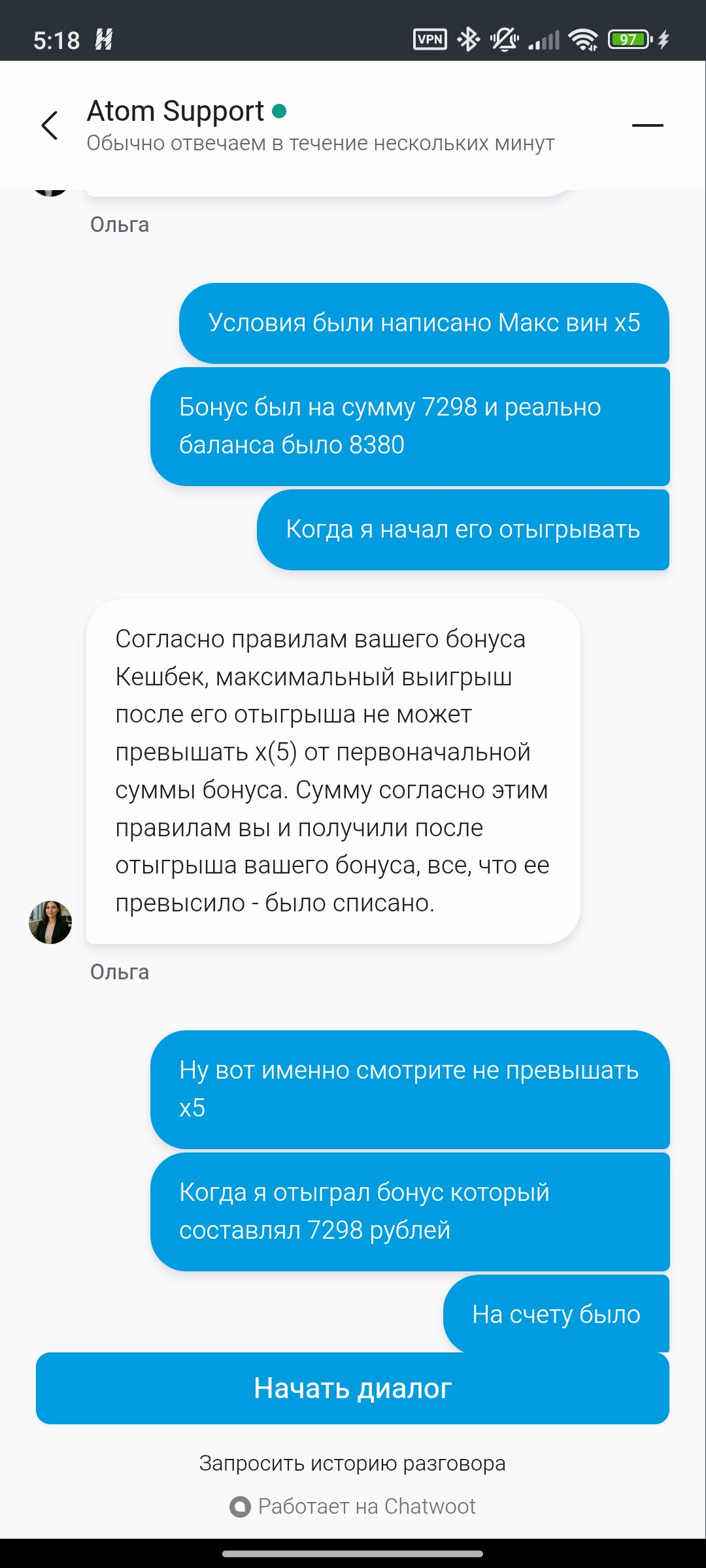 И ещё раз если вы обратите внимание на ответ вашего оператор не бота,бот отвечает что ограничений на вывод нету..то оператор написал что согласно условиям моего бонуса максимальный выигрыш после отыгрыша бонуса не может составлять больше чем х5.
