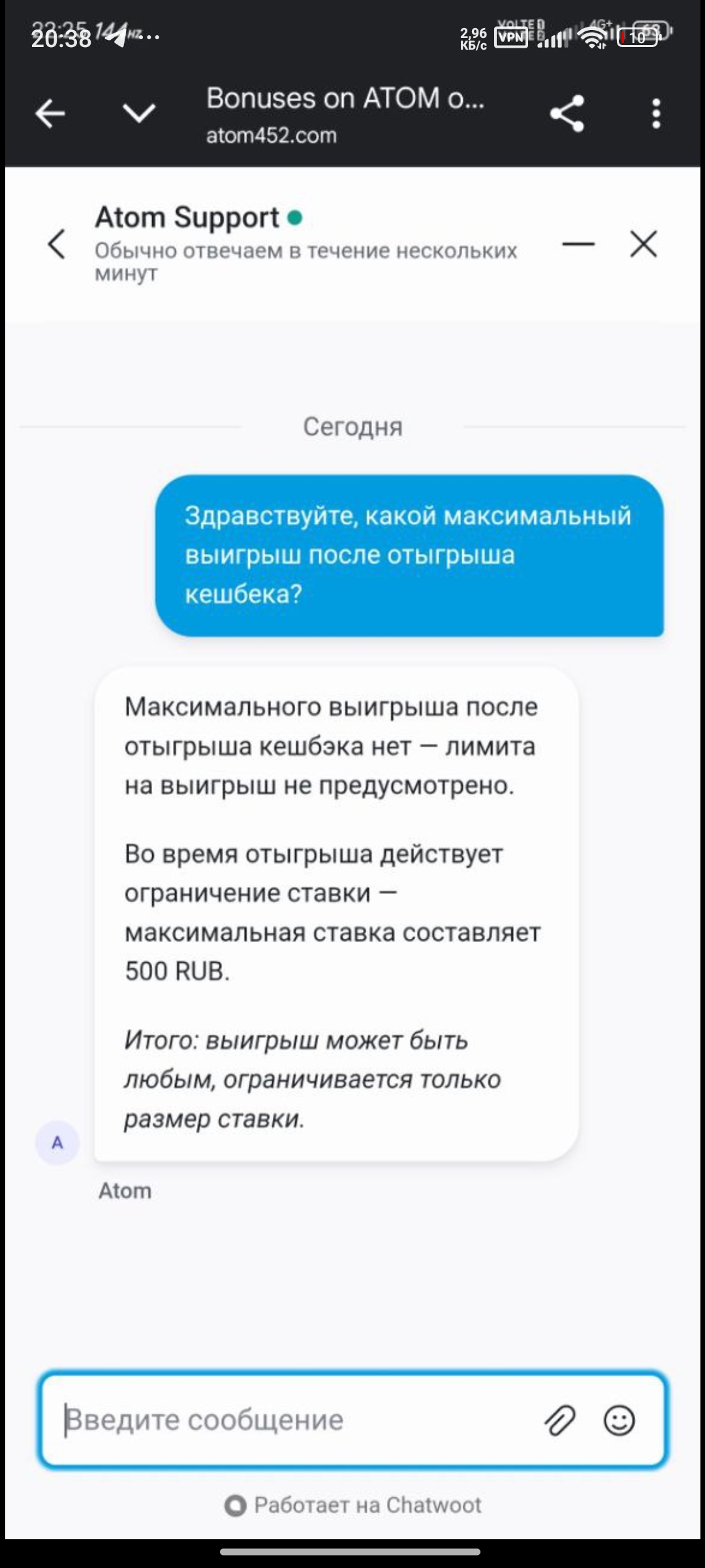 Написал блогерам,узнать почему же так,почему я не могу получить свой выигрыш в том размере в котором было заявлено, а все достаточно просто,Модератору казино стримера Лорда(являюсь его реформ)дали ответ на этот вопрос,ответ прикреплю в скриншоте,видимо и мой бонус уже активированный каким то образом изменил Макс вин,но не изменил вейджер,по суммам ставок это можно проверить,но Casino Atom этого не делает,ещё утверждают что я не использовал реальный баланс при отыгрыше на что я тоже приложу скрины,и там видно баланс до активации бонуса и после.