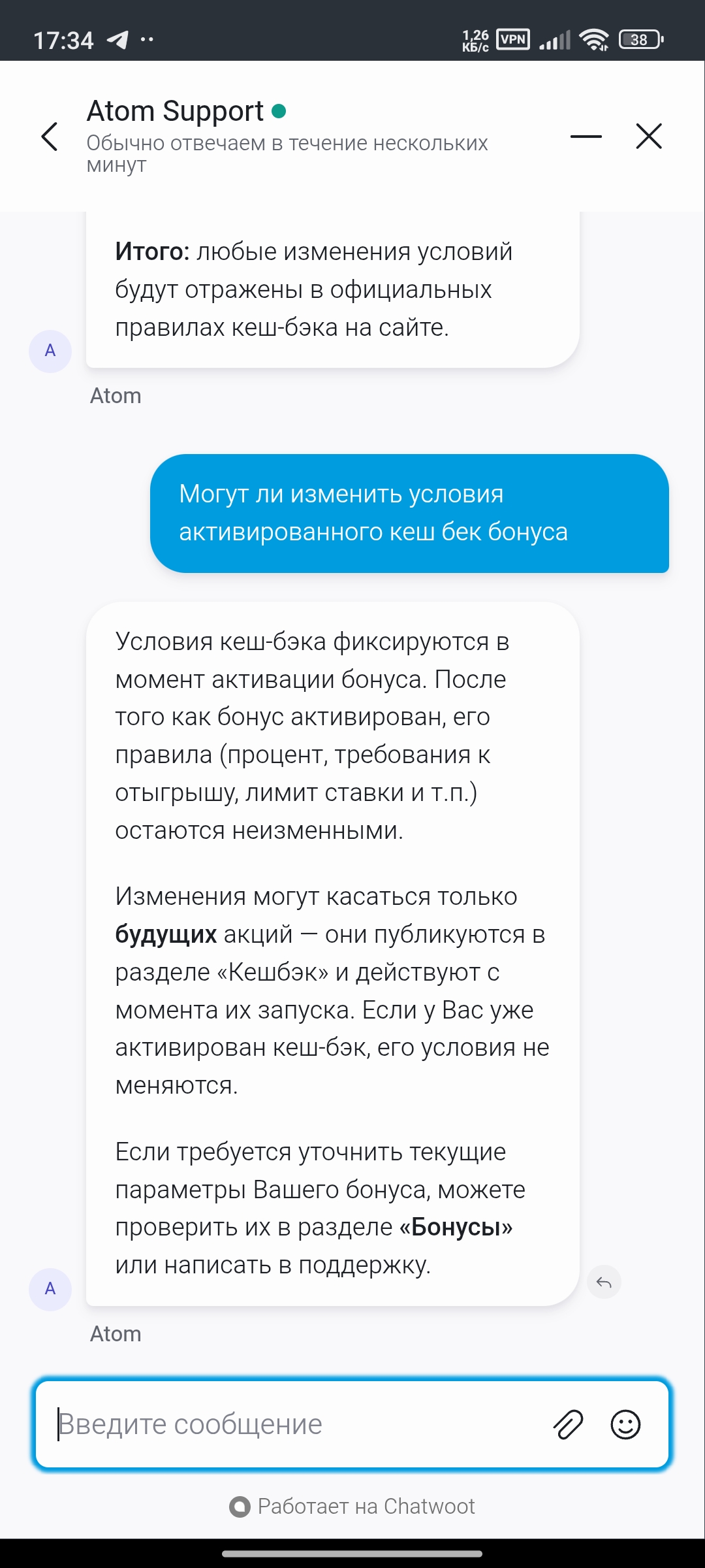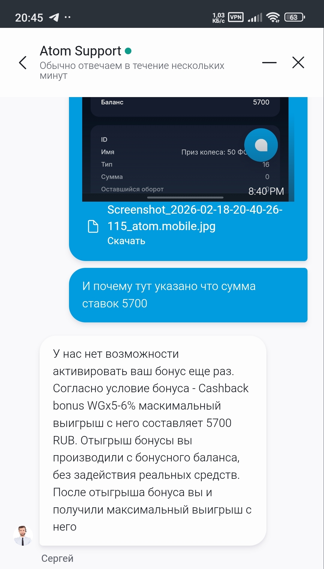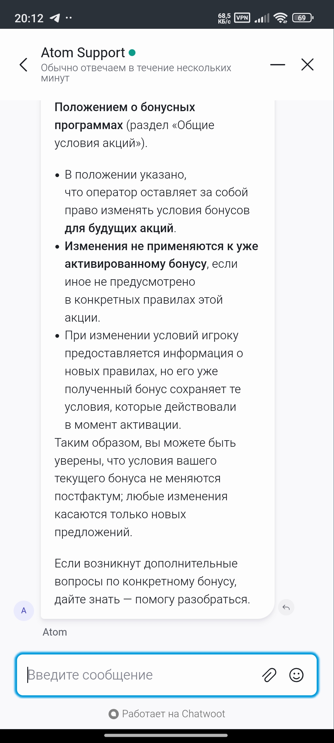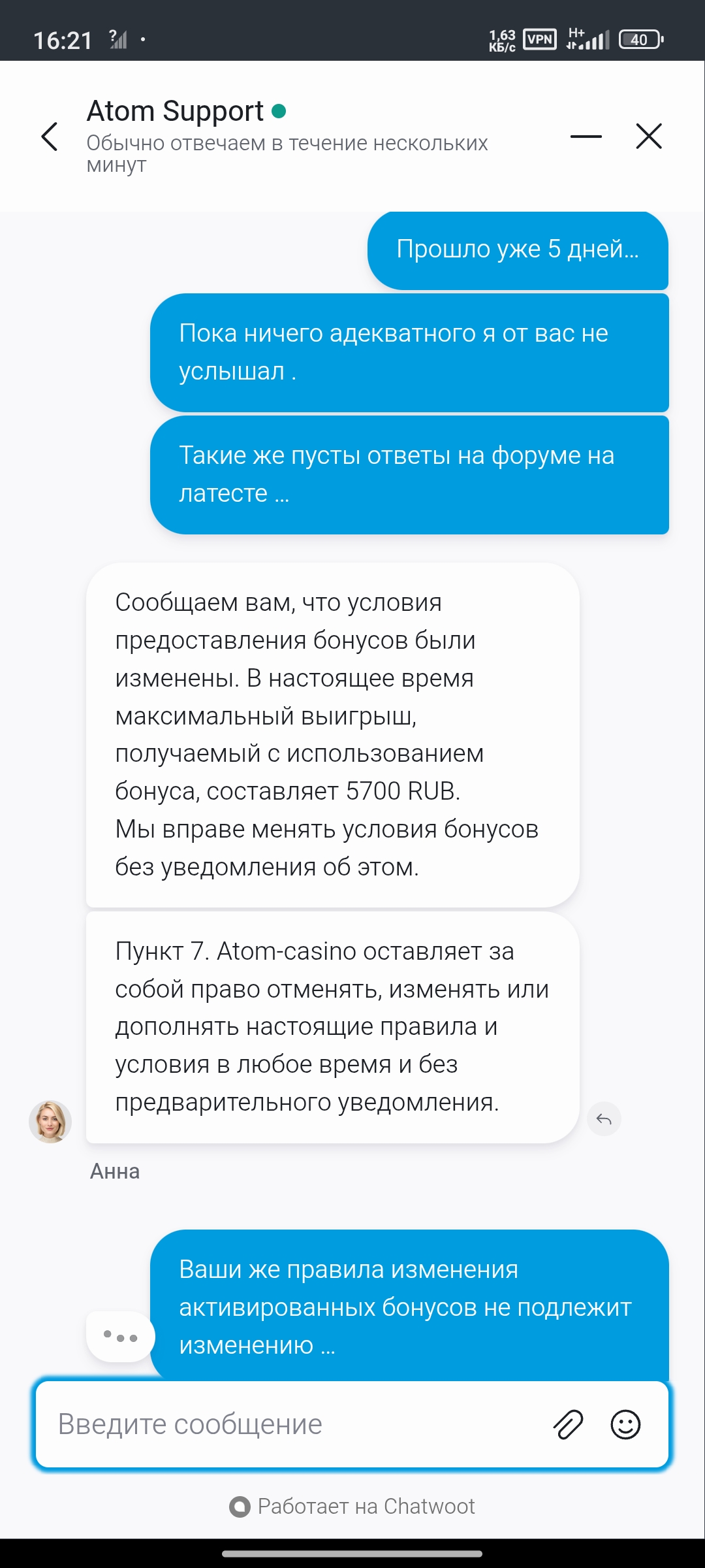 @vyacheslavlenin (VyacheslavLenin),уважаемый администратор,можно каким-то образом повлиять на Casino Atom,предоставил все возможные доказательства,что казино изменило условия моего бонуса ссылаются на пункты правил которые вообще никакого отношения не имеют к бонус кеш Беку,доказать им что-то через поддержку невозможно просто говорят одно и тоже,кидаешь им их же правила,в которых четко все прописано,говорят дали вам ответ друго ответа нет и закрывают чат .