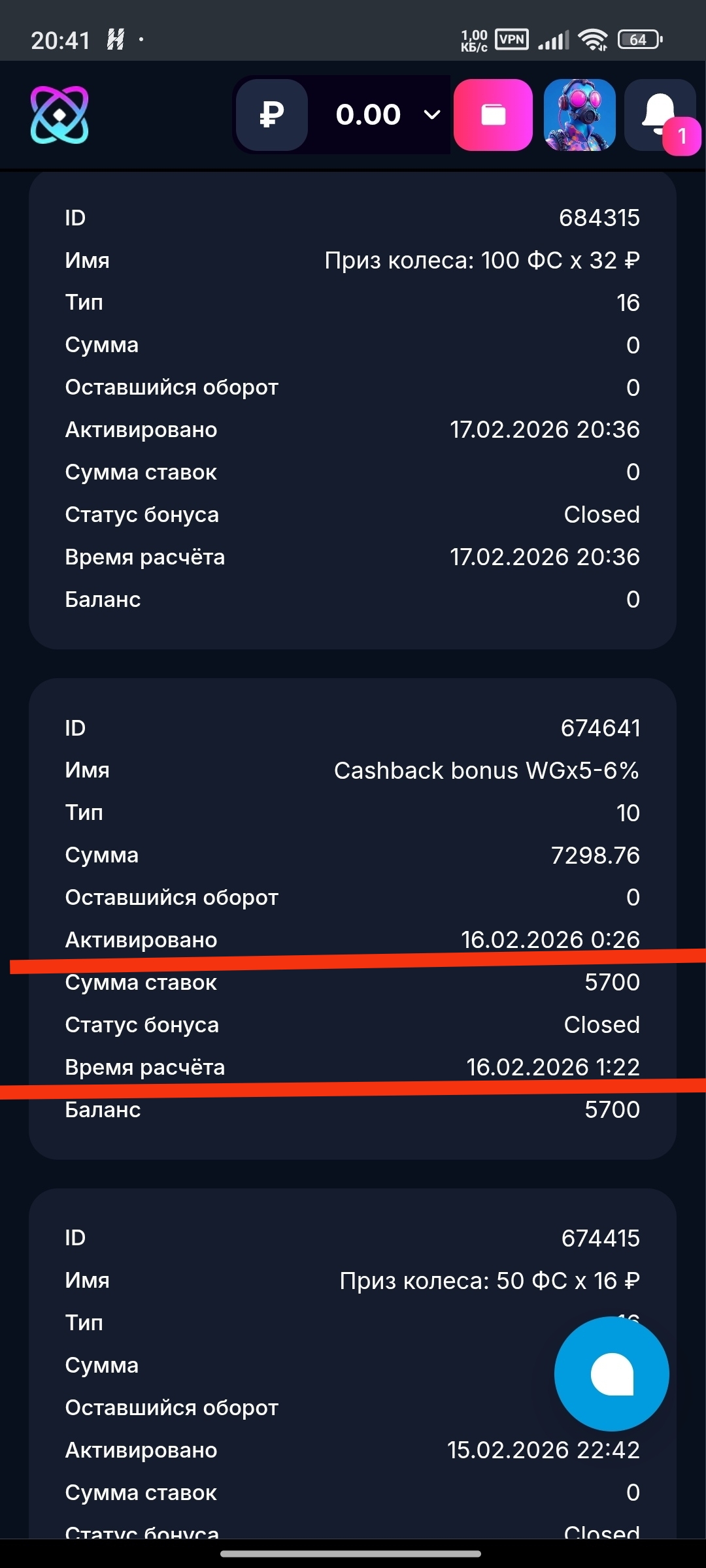 По результатам проверки видим, что бонус был отыгран корректно, а итоговая сумма на бонусном балансе была ограничена параметром максимального выигрыша, установленным именно для активированного бонуса. В Вашем случае максимальный выигрыш по данному кешбэку составил 5700 RUB, поэтому после завершения отыгрыша система оставила на балансе сумму в рамках лимита, а остальная часть, сформированная сверх ограничения, была списана согласно условиям бонуса. Начисление и списание отработали корректно.
