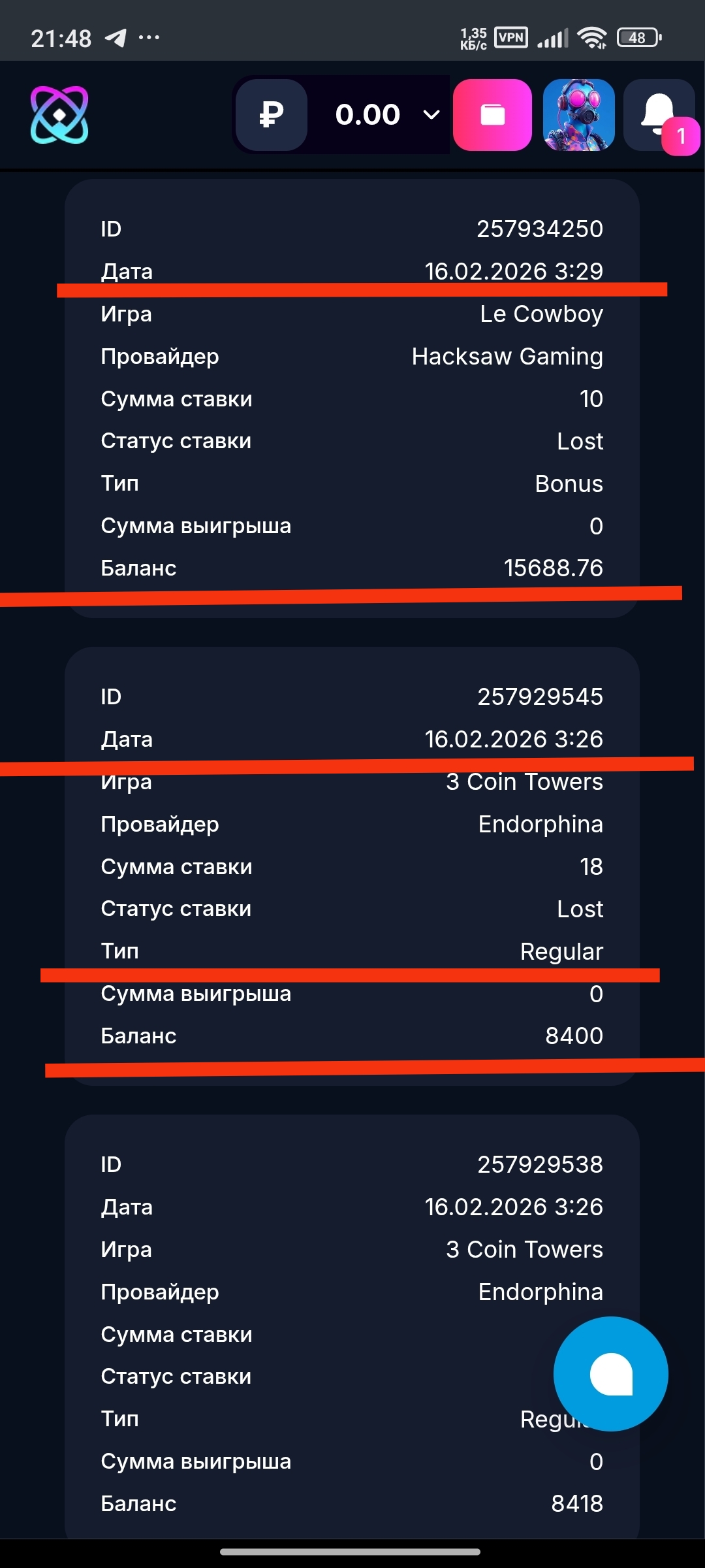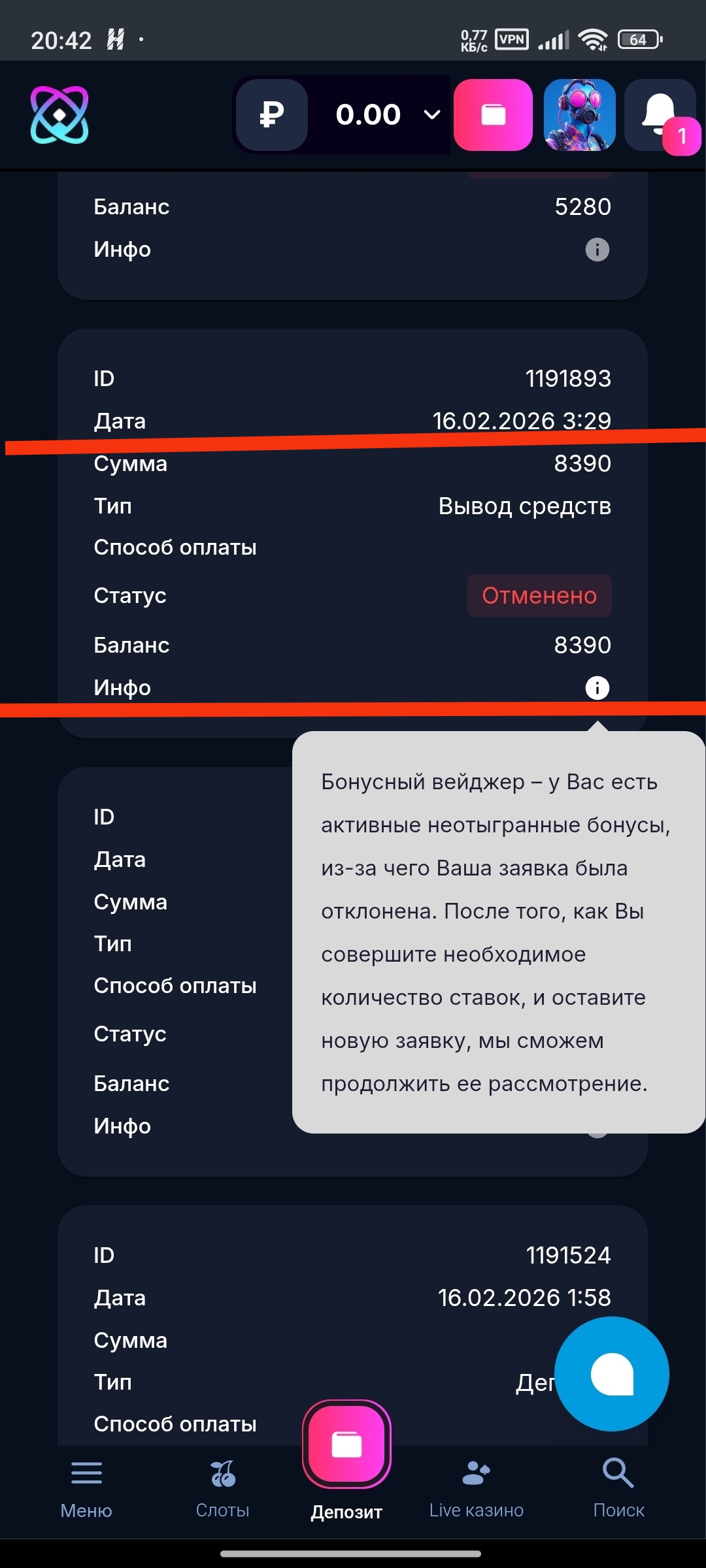 Суть вопроса в том что у меня был кеш бек бонус в размере 7298 рублей с вагером х5, вагер я отыграл,на момент окончания отыгрыша Вагера на балансе было 302 тысячи рублей,после того как сделал последний спин,и вагер закрылся денежные средства с бонусного баланса списали и оставили 5700 рублей,писал в поддержку но ответ один что они правы и все они выплатили правильно.