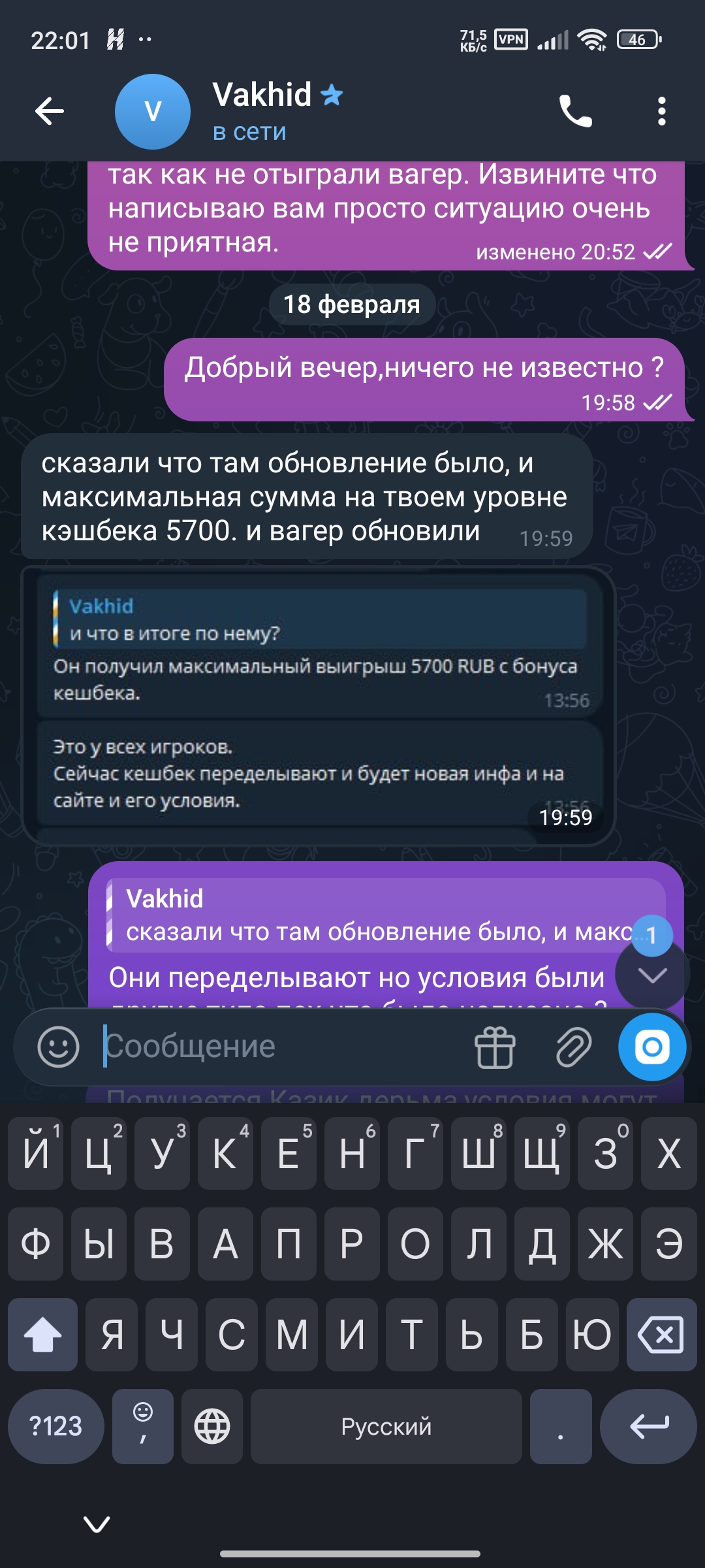 И снова здравствуйте и спустя 5 дней ваша поддержка наконец-то согласилась и ответила правду в том что вы изменили у моего кеш бек бонуса правила…с Макс вина х5 на максимальный выигрыш 5700 рублей…изменили когда уже активировал его прикольная механика …
