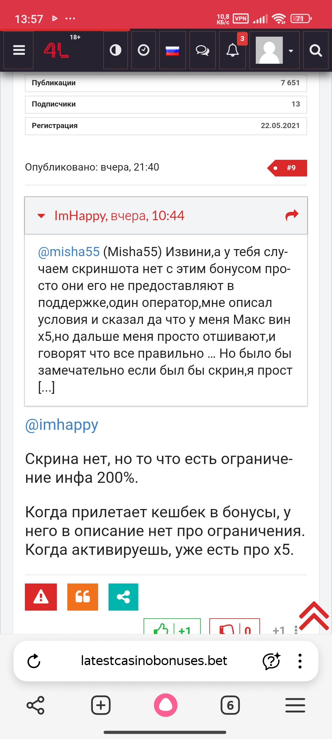 Ещё один момент странный что я заметил это время активации и закрытия бонус кеш Бека он отличается от действительности на скриншотах выше видно что я активировал бонус в 03:29,а закрыл его в 04:22,а в истории бонусов указано другое время… Так же на форуме в разделе с этим казино человек ответил по поводу кеш Бека и у него он тоже был х5 как и у меня,как и говорил оператор из поддержки казино,об этом прикладывал скриншот в шапке обращения.Но поддержка говорит,если у вас нет скриншота,то что написал оператор не является подтверждением,но как не является если он описал условия моего бонуса который я активировал.