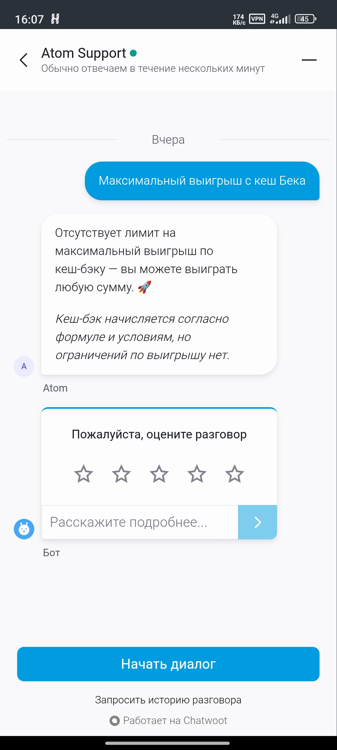 У вас нас в поддержки можно узнать все правила и информацию но на все что он выдает вы говорите что ИИ выдает не верную информацию и он ещё учится ..но как это должно волновать игроков,написано “да” ваша ошибка “да” ну значит и исправляйте это все возместить мои деньги,Вы нарушаете свои же условия,свои правила если это для вас в порядке вещей то мне кажется людям надо знать что вы не очень хороший проект и не стоит у вас играть.В этих двух скриншотах как вы утверждаете у вас ошибка,но почему игрок должен страдать от вашей ошибки вы ссылаетесь на правила которые не относятся к кеш Беку…. Все очень странно и не понятно