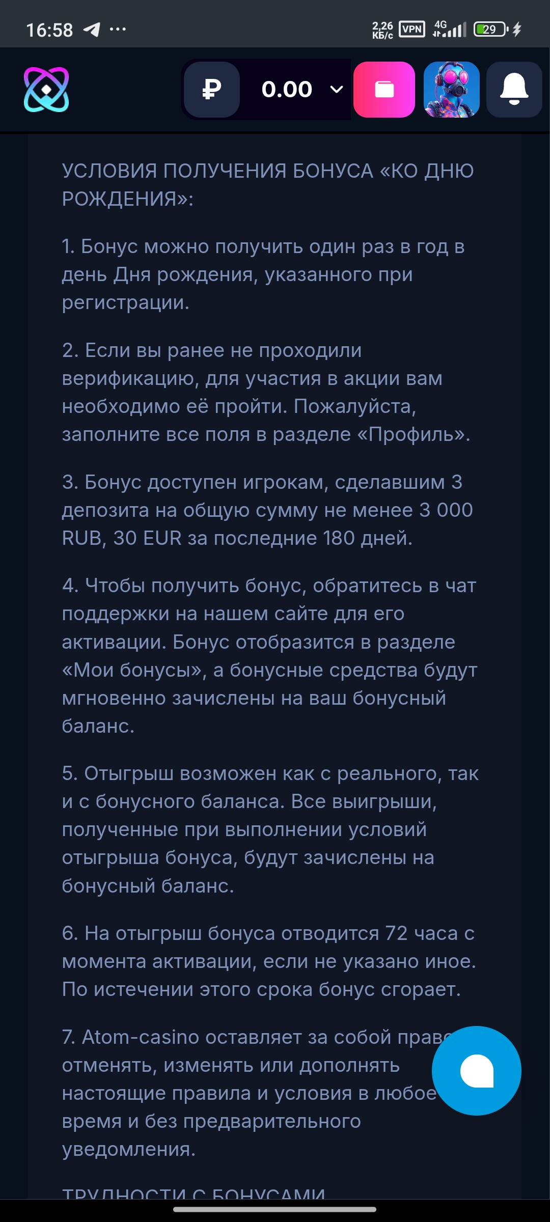 Если вы ссылаетесь на пункт 7 своих же правил,то будьте добры пожалуйста вниките в свои же правила и не вводите игроков в заблуждение и не обманываете своих игроков на деньги этот пункт 7 относится к сводке правил по “Бонусу для дня рождения”
