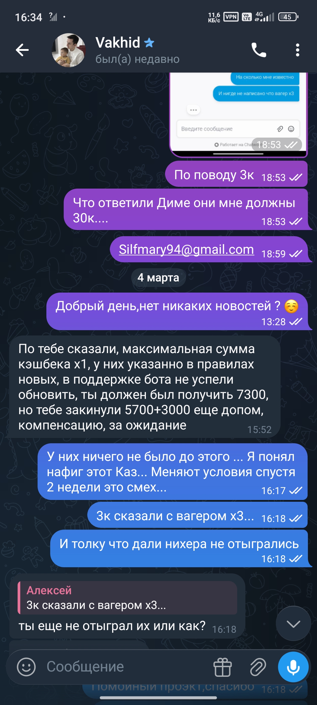 Всем добрый вечер, хотелось бы еще добавить, ко всему выше сказанному, проект очень странный до безумия, их поддержка вот от слова нулевая… Ни в чем помочь не могу и разобраться тоже… По своему кеш Беку помимо форума обращался к блогеру, через которого попал на это казино “Дмитрий Лорд”. Он обратился по поводу меня к модераторам проекта, как итог мне начислили 3 тысячи рублей, но есть но, я не знал, что это за 3 тысячи и я обратился в поддержку, чтоб мне сказали, что это за деньги. Как мне ответили в поддержке, скрин я приложу. После я ещё раз обратился к стримеру, чтоб он как-то повлиял на них… Мне сказали ждать, как итог вот сегодня я получил ответ от модера стримера… 3 тысячи якобы за выигрыш в конкурсе оказались дополнением к выигрышу… но с х3 вагером… И то, что они меняют свои условия как хотят, это отвергает невероятно сильно… Скрин прилагаю