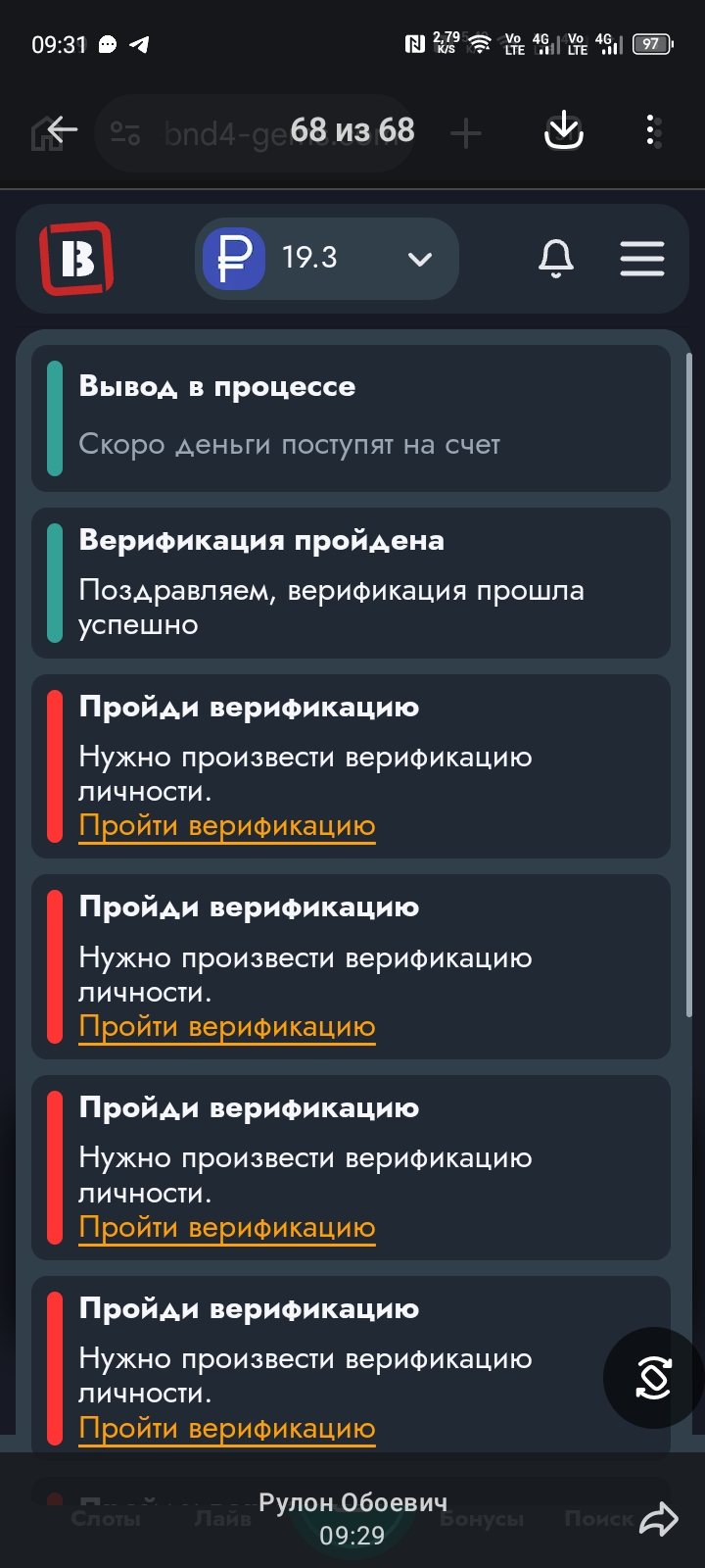 Добры дзень, зарэгістраваўся на казіно Banda, зрабіў дэпазіт на 451₽, удалося выйграць 14000₽, паставіў на выснову, прыйшоў адмову, запыталі верифікацыю, прайшоў паспяхова, але абмежаванне на вывад не знялі, у падтрымцы сказалі чакаць, пасля прыслалі, што трэба прайсці верифікацыю з пашпартам і аркушам A4, цяпер ім не падабаецца якасць фота, хоць усё чытаема. Пакуль чакаў верифікацыю, удалося выйграць да 197000₽, зараз засталося 105000₽, прашу абмежаваць мяне ў стаўках на слотах да поўнага выводу сродкаў і суправаджаць мяне з маёй праблемай.
