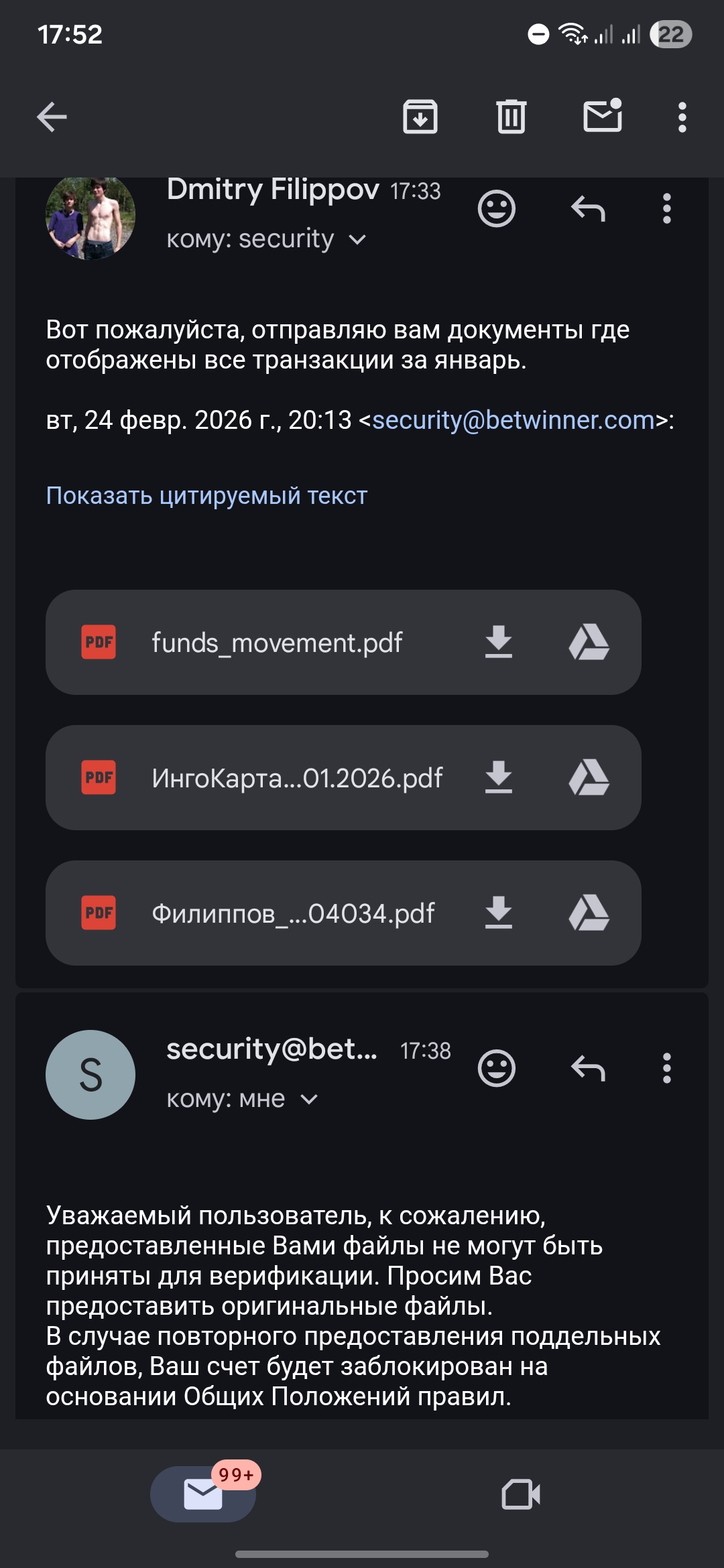 Присылаю 3 документа, они через 5 минут отвечают, что они не оригинальные и грозятся заблокировать. Ну смешно же. За 5 минут успели проверить?