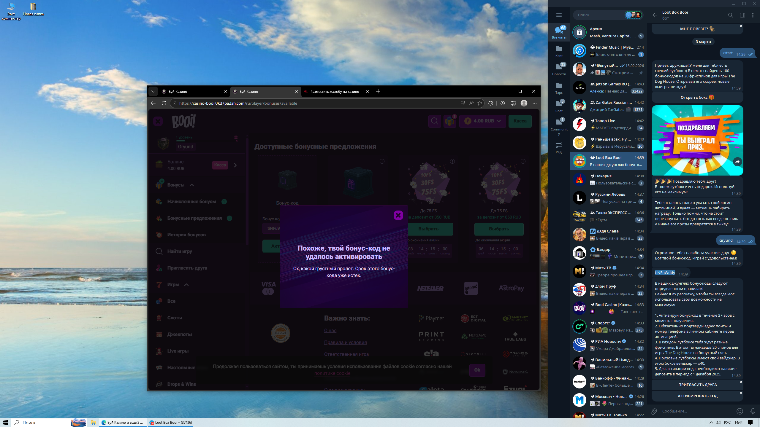 Booi Casino: 03.03.2026 не активируется промокод из лутбокса
