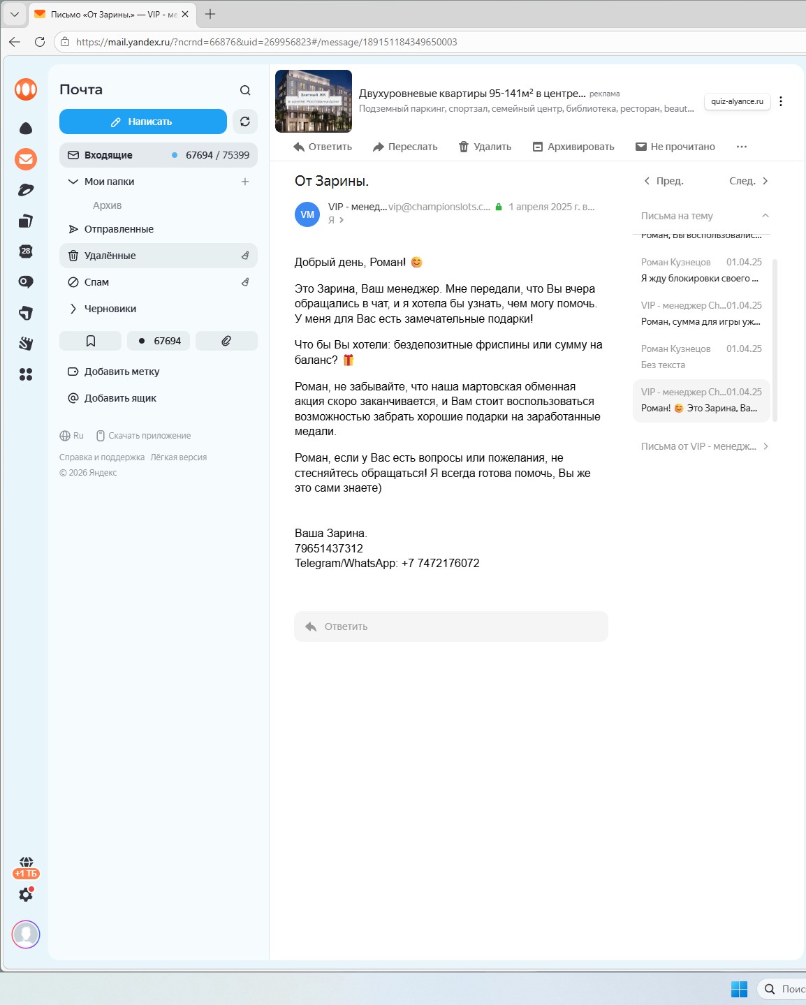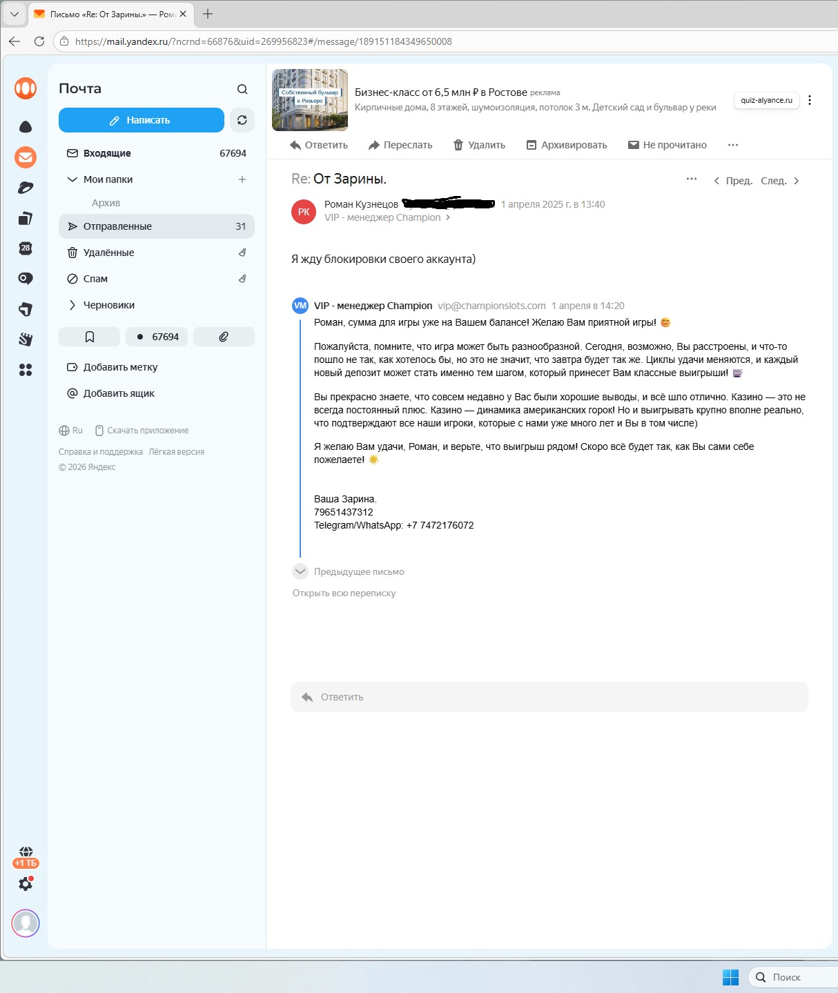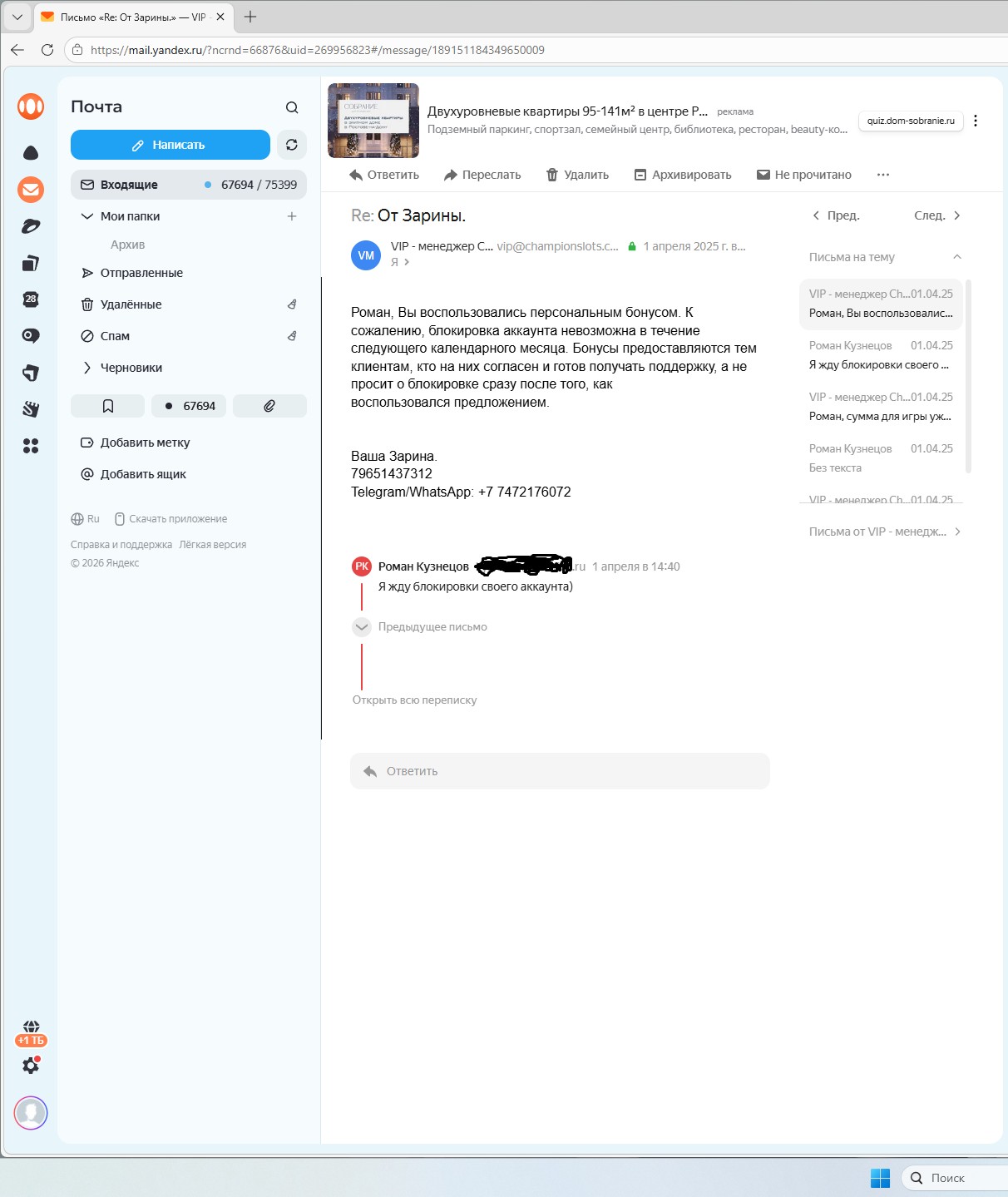 Проиграв бонус и уведомив, что я все равно ожидаю блокировки аккаунта ( что могу подтвердить перепиской на почте), мне приходит сообщения от вашего представителя вип- менеджера, специфического характера, по моему мнению напрямую нарушающее правила проекта и лицензии в области борьбы с игровой зависимостью.