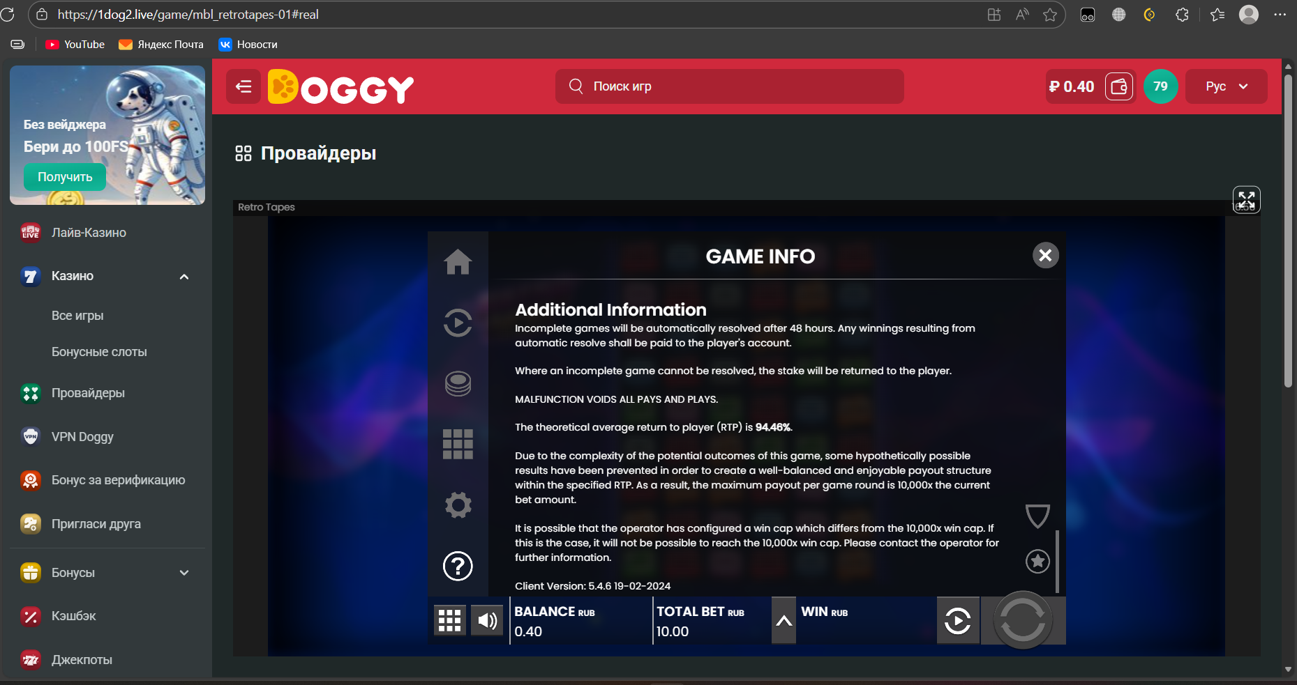 Ещё стоит отметить в странности, что у них работает push gaming, ведь я играю с русского ip, а push gaming ушёл из РФ, при этом rtp всех их доступных слотов урезана на ~2%!