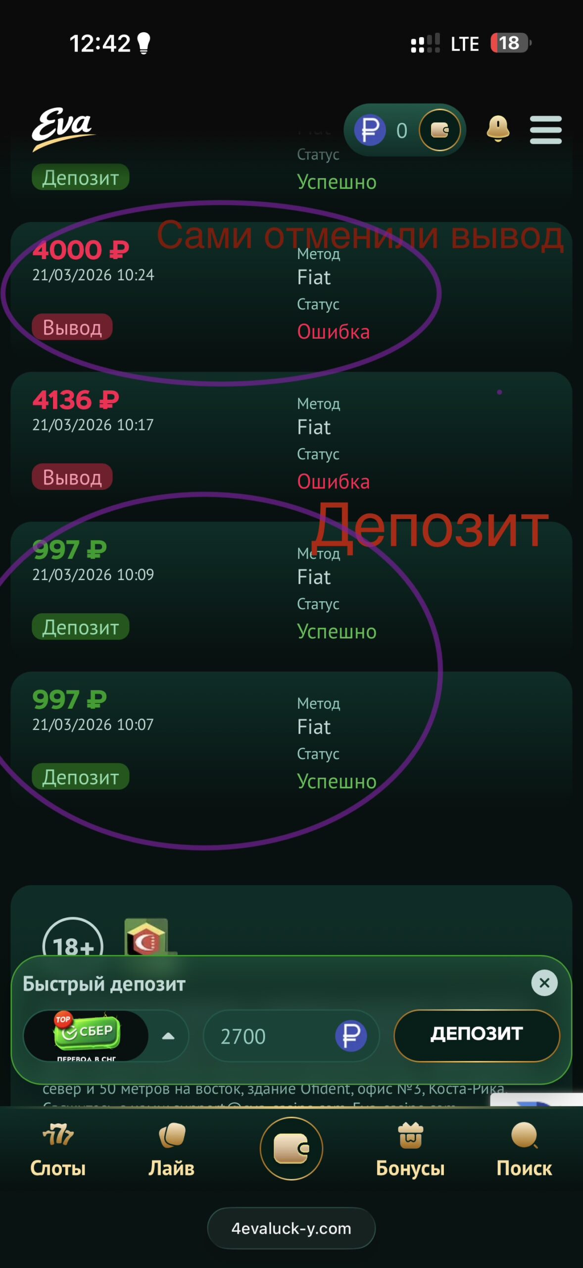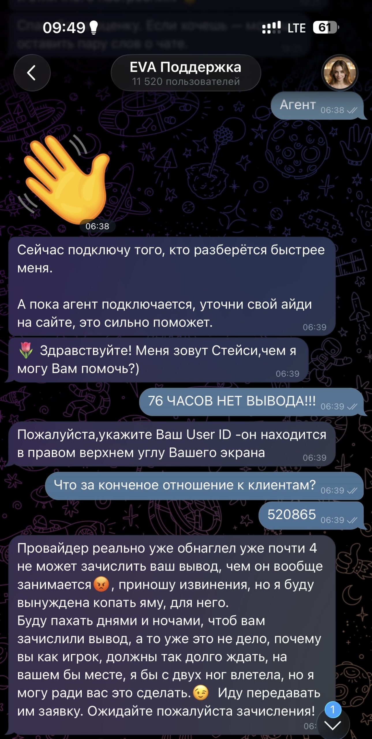 Eva Casino: с 21.03.2026 не проводят выплату на 576 USD
