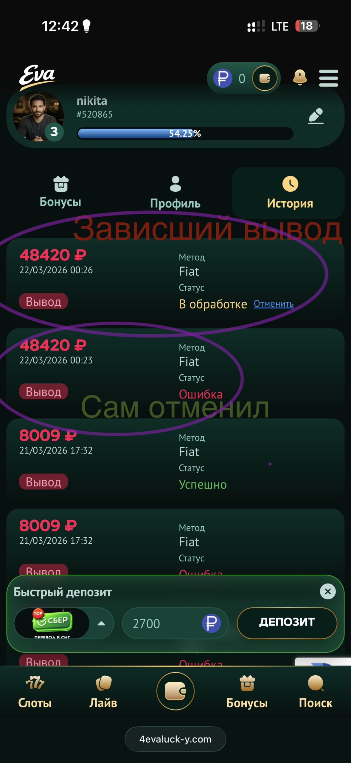 Прэтэнзія Nikita4877 да Eva Casino ад 23.03.26