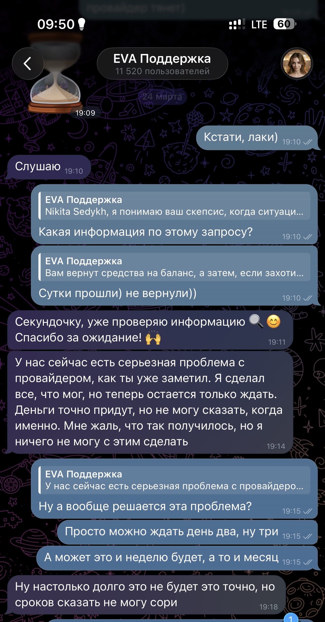 і вось прайшло 36 гадзін. Неаднойчы пісаў у падтрымку: кажуць мы нічога зрабіць не можам, грошы ў правайдэра. Чакайце. Тэрміны нам невядомыя. Тыпа мы пацвердзілі. А далей ужо пытанні не да нас, але грошы абавязкова паступяць. Груба кажучы фармальная адпіска, хоць магу памыляцца.