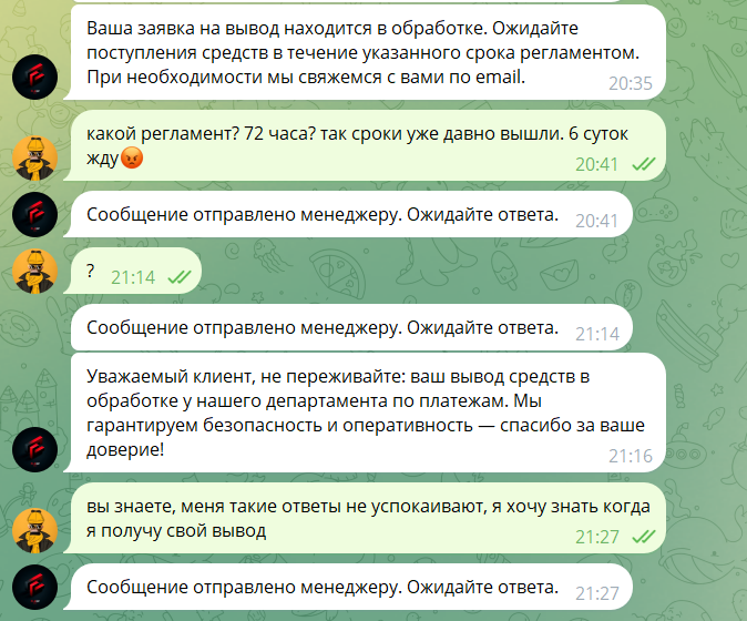 @manager Здравствуйте. Смотрю соседние жалобы, Вы им выплачиваете, я жду неделю свою выплату. Вчера написал в ТГ и смешно стало, что у вас за регламенты такие?