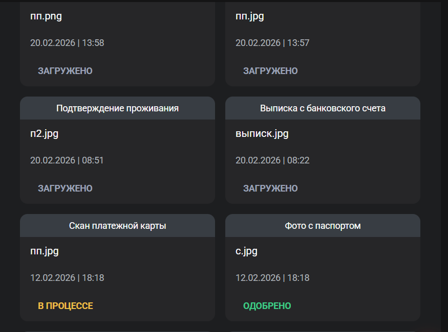 Верификация пройдена успешно. Все необходимые документы, включая последнюю загруженную выписку, проверены и одобрены. Ваш аккаунт полностью верифицирован.