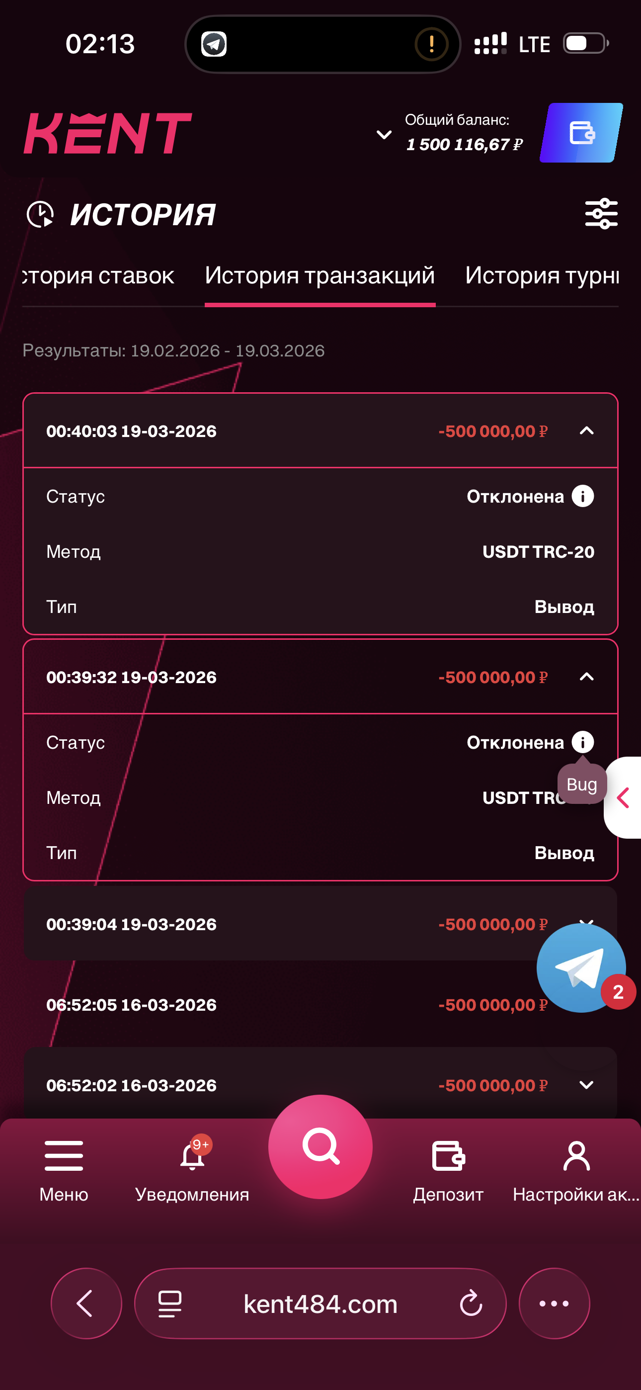 Kent Casino: с 13.02.2026 нет моего депозита на 1021 RUB