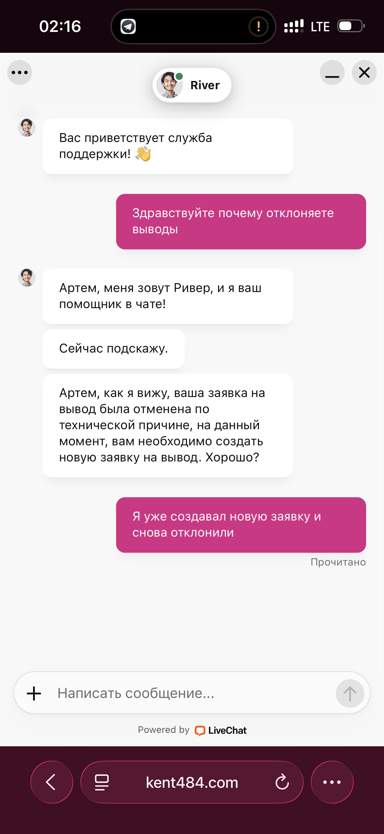 Прэтэнзія Artem4eg да Kent Casino ад 18.03.26