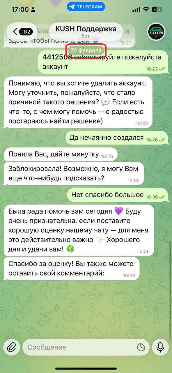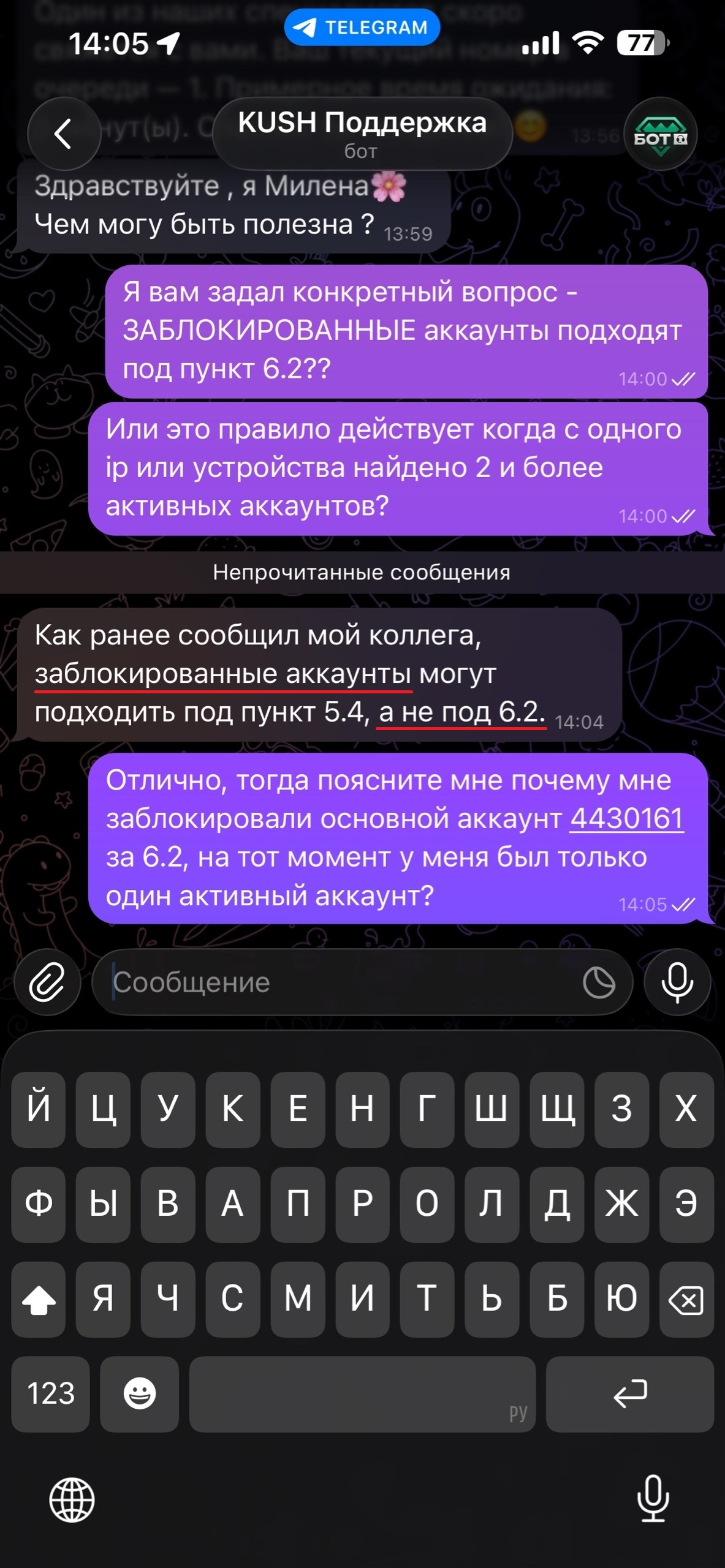 Хочу дополнить жалобу доказательствами своей невиновности. Как заявляет техподдержка в telegram – заблокированные аккаунты НЕ относятся к правилу 6.2, но почему то его применили. Так же предоставляю скриншоты, доказывающие что все мультиаккаунты были заблокированы и на момент регистрации крайнего аккаунта он был единственный активный