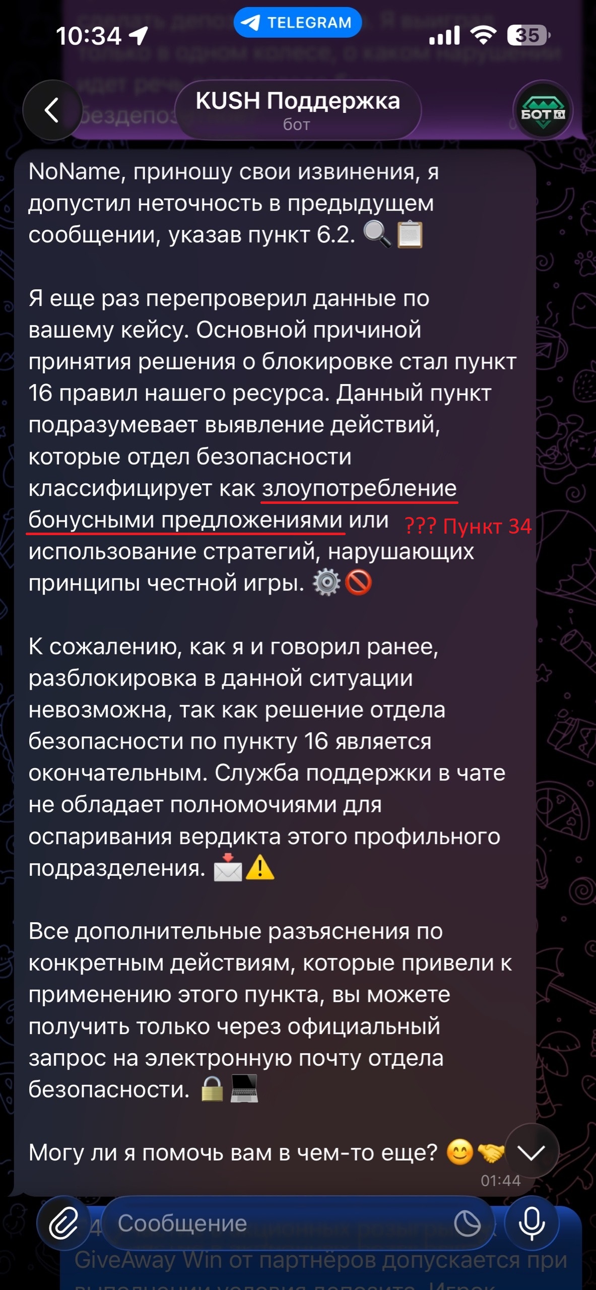 Что касается пункта 16 – служба безопасности приписывает злоупотребление бонусами, хотя после единственного розыгрыша были сделаны два депозита (В правилах минимальный депозит в виде 1000р указан только за 3 выигрыша). На аккаунте был выигран всего лишь ОДИН бонус! Исходя из условий пункта 34 о каком злоупотреблении идет речь? Почему на исходящий аккаунт применяются санкции за раннее заблокированные аккаунты? При чем блокировки были по моей инициативе, так как я знаю что мультиаккаунты запрещены