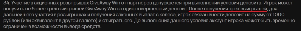 27.02.2026 внес 2 депозита по 100 рублей, выиграл в колесе у стримера 1000 рублей. После чего выиграл крупную сумму, при выводе естественно запросили верификацию, и спустя сутки чудным образом выявили нарушения по пунктам 6.2 и 16, хотя на момент проверки у меня только один действующий аккаунт (Твинк был заблокирован ДО депозита и розыгрыша, скриншот #1 со временем мск+3) Еще и приплели пункт о мошенничестве, в чем заключается злоупотребление розыгрышами, если я поучаствовал всего в одном? Очень удобно прикрываться подобными пунктами лишь бы не выводить средства.