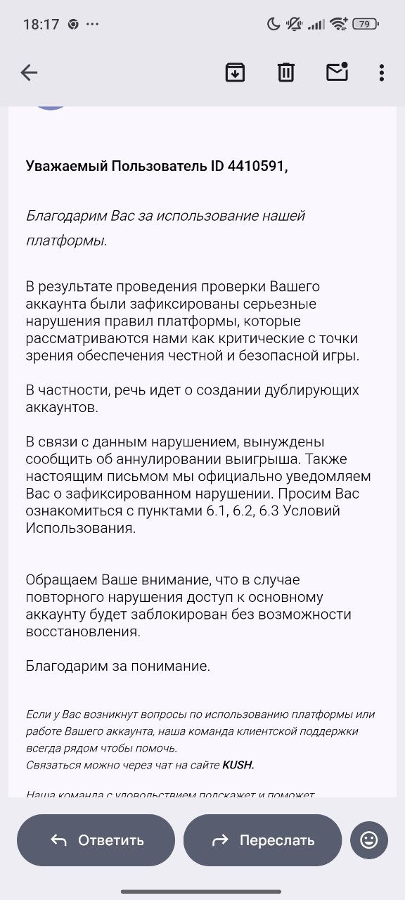 Я уже смирился с тем, что свой законный выигрыш я не получу, но пусть моя жалоба послужит отличной рекламой для данного казино, что играть там не стоит, выигрыш вы не увидите. Они найдут 333 причины, чтобы вам ничего не выводить, а это затянутая верификация, отказы во временной блокировке, мониторинги или как в моем случае мульти аккаунт 😏