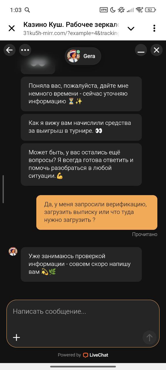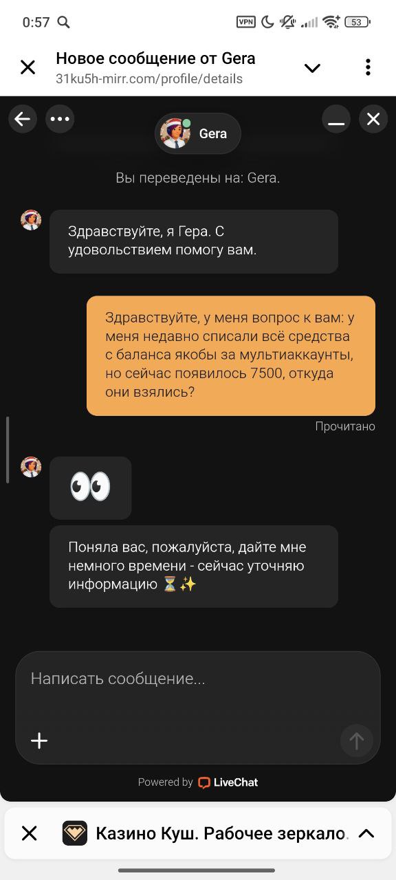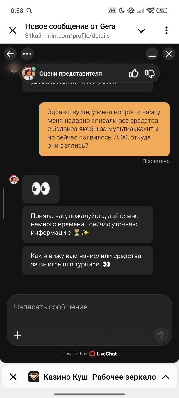 Здравствуйте, играл на казино «Куш», было всё нормально, пока не выиграл 3800$ и запросили верификацию, я всё отправил, они мне ответили по причине не туда загрузил, второй раз такая проблема, 3 раз загрузил — вообще молчат, не отвечают по 24 часа, поддержка молчит, всё молчат, не хотят выводить деньги, нету там поддержки нормальной даже, помогите в решении моего вопроса, хочу, чтобы они быстрее верификацию одобрили, и я вывел свои честно выигранные деньги