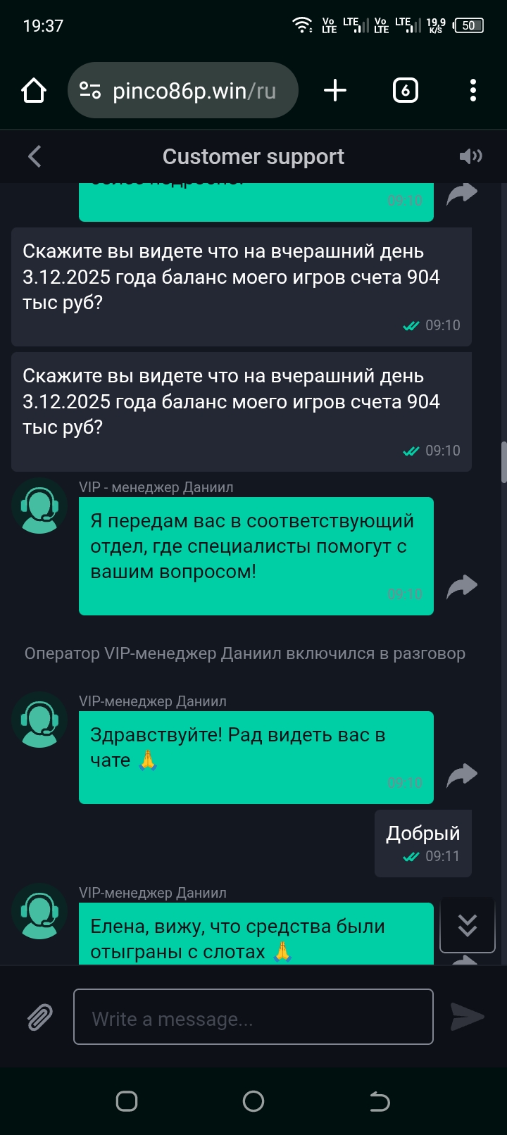 Pinco Casino: 03.12.2025 с баланса исчезли деньги на 904.000 RUB