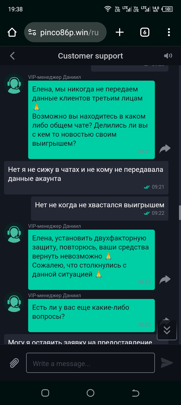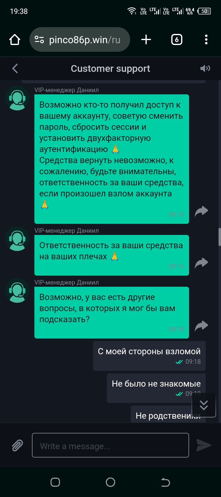 Позиция компании по данному вопросу является окончательной. По результатам проведенной проверки основания полагать, что имел место сбой либо некорректная работа системы платформы, повлекшие несанкционированный доступ третьего лица к вашему аккаунту, отсутствуют.
