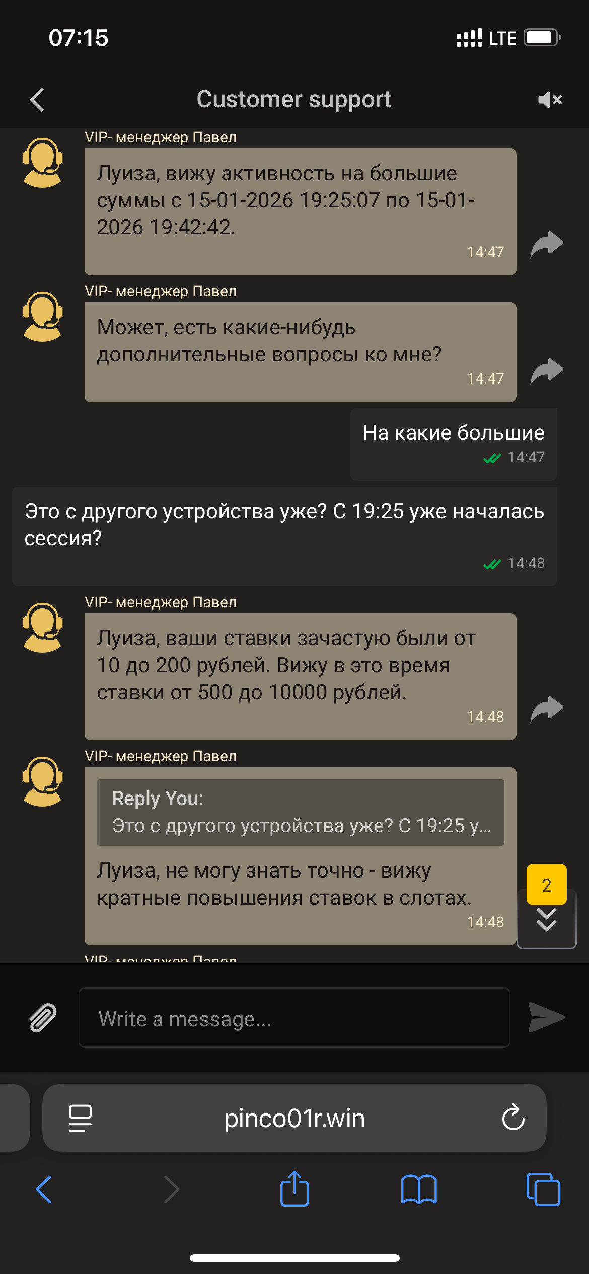 Вячеслав и представитель Pinco помогите разобраться с этим недоразумением, та самая сумма которая было проиграна в слотах,