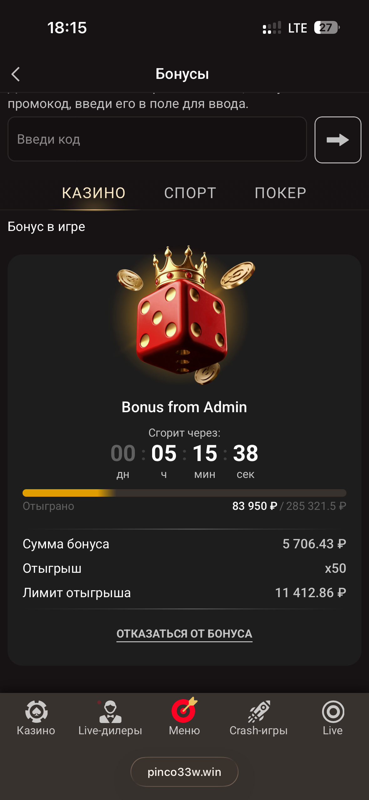 18.03.2026 я звярнулася ў чат падтрымкі з пытаннем, ці ёсць для мяне нейкая індывідуальная дэпазітная прапанова. На што ў чаце мне, зразумела, сказалі, што ніякіх індывідуальных прапаноў для мяне няма ні дэпазітных, ні бяздепазітных. Выйшаўшы з чаце падтрымкі, я вырашыла скарыстацца новай акцыяй «кінуць кубікі». Кінуўшы ў кубікі дзесьці каля 10 раніцы, выпадзіла адзінка і шасцёрка, гэта мінімальны бонус на дэпазіт 50%. Пасля зайшла ў касу і зрабіла дэпазіт праз крыптавалюту на суму 11 з чымсьці тыс. руб. Звярнула ўвагу на тое, каб бонус па гэтай акцыі не быў залічаны адразу, як гэта звычайна бывае. Зашла ў чат падтрымкі, на той момант ён быў недаступны, унізе не было радка ўводу тэксту, што вельмі частая з’ява на гэтай пляцоўцы. Падумаўшы, што бонус усё ж залічваецца аўтаматычна, зайшла ў слоты і стала спакойна адыгрываць бонус. Праз 3,5 гадзіны дэпазіт быў цалкам прайграны. Выйшаўшы ў галоўнае меню, я обнаружыла, што бонус па гэтай акцыі так і не быў залічаны, хаця да гэтага часу гэты бонус павінен быў ужо на 100% быць адыграны, калі б залічыўся своечасова.