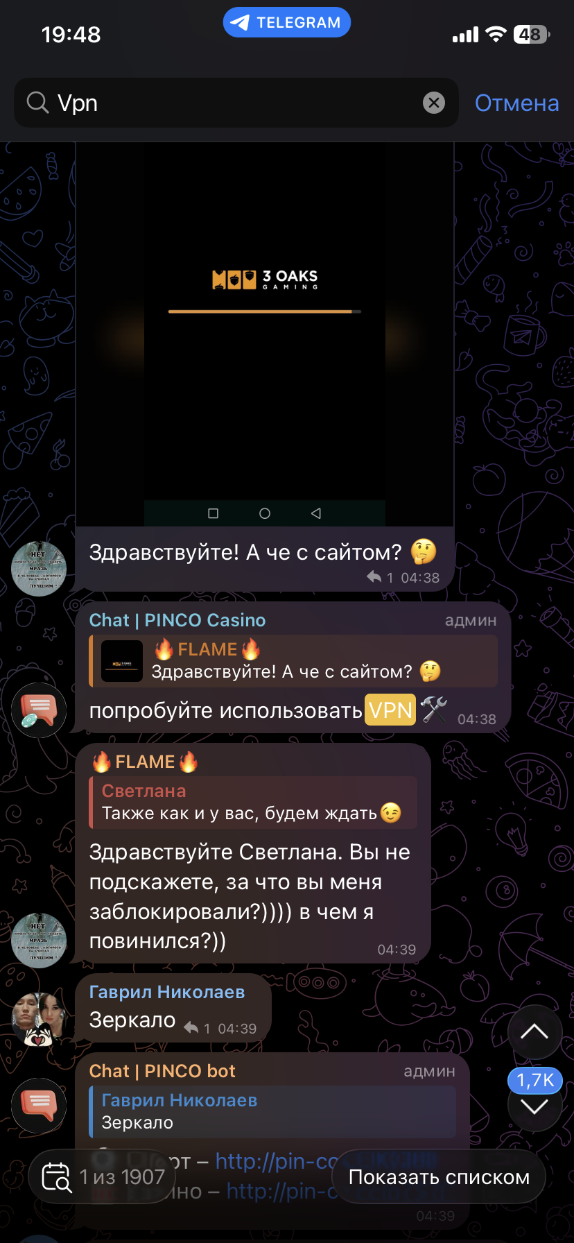 Предполагается,что доступ ко всем данным мошенники получили через приложение «Матрешка:Россия»,причина использования-нестабильная работа сайта,использование рекомендует админ телеграмм-канала казино Pinco. Я играю уже далеко не первый год и средств было потрачено гораздо больше,чем выведено,и эти 100 000,были жизненно мне необходимы. Я считаю,что я их наиграл честно,и никто не в праве у меня их забирать.