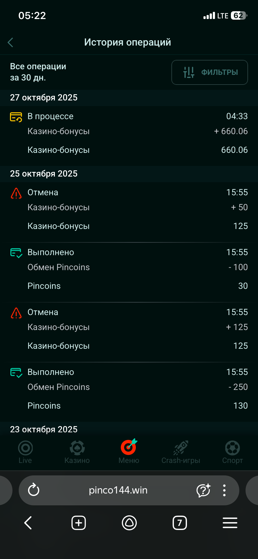 Pinco Casino: 23.10.2025 исчезли деньги с баланса на 100.000 RUB