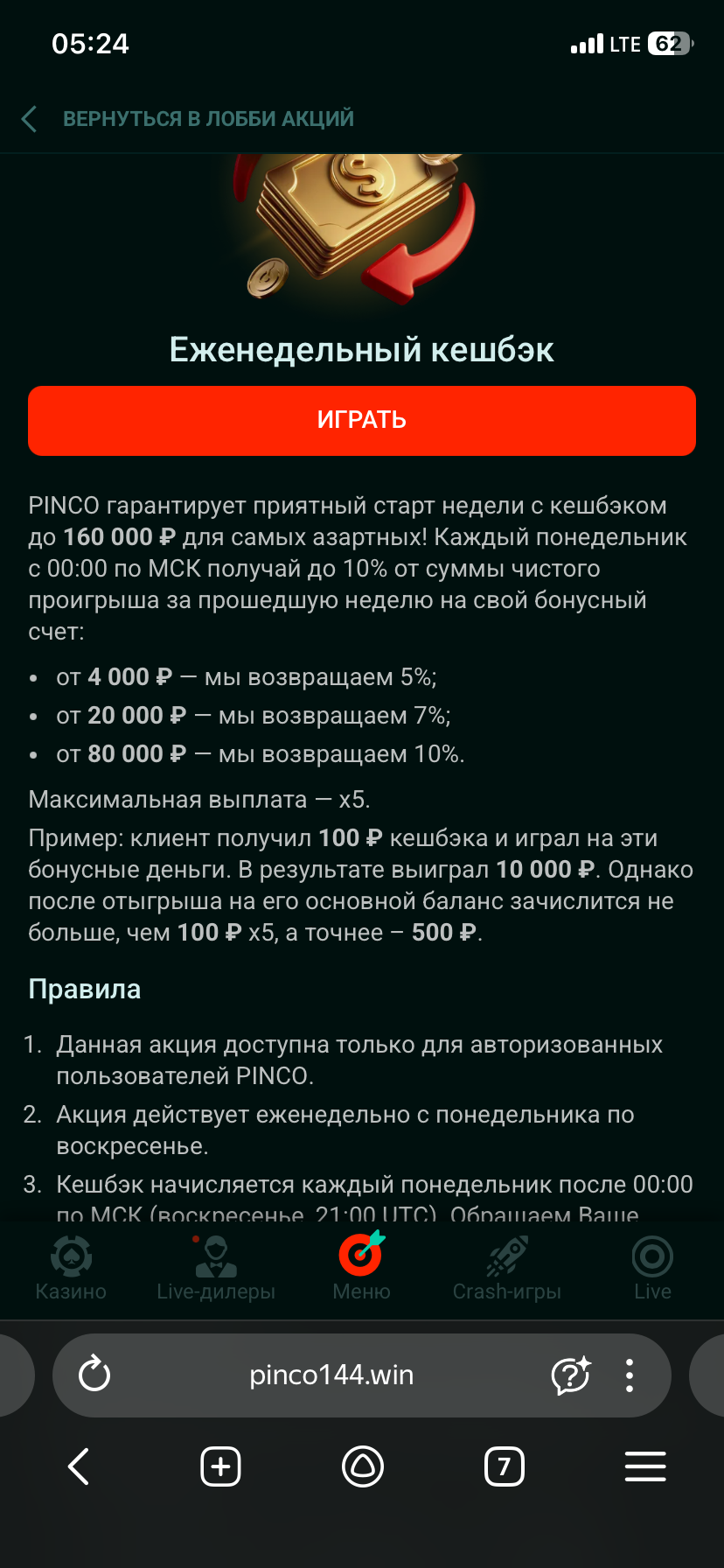 @pinco1 и вот ещё одна странность,еженедельный кэшбек! Мне начислили 660 рублей с копейками,учитывая,что (как вы говорите) 100 000 были потрачены в слоте,кэшбек от суммы проигрыша более 80 000 рублей составляет 10%. Но что-то не похожи эти 660 рублей на 10 %!